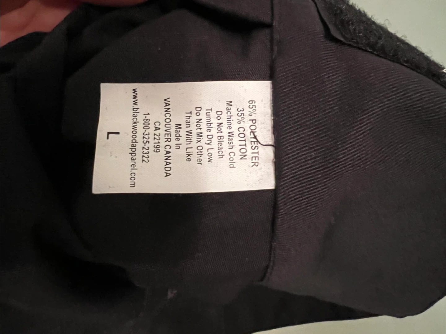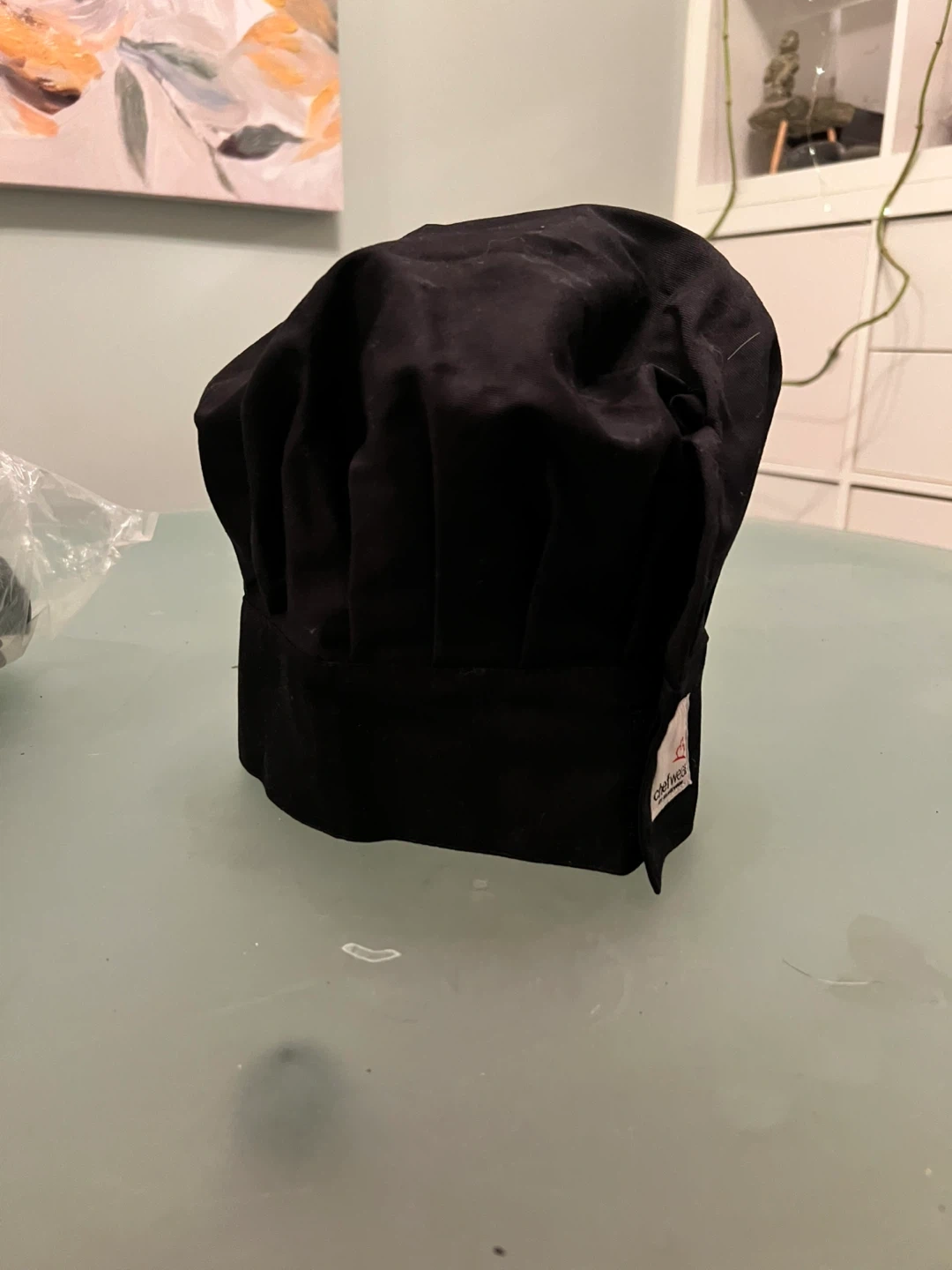 This is a black Chefwear toque hat, size large. It's made of a 65% polyester and 35% cotton blend. This hat is suitable for kitchen staff or culinary students.