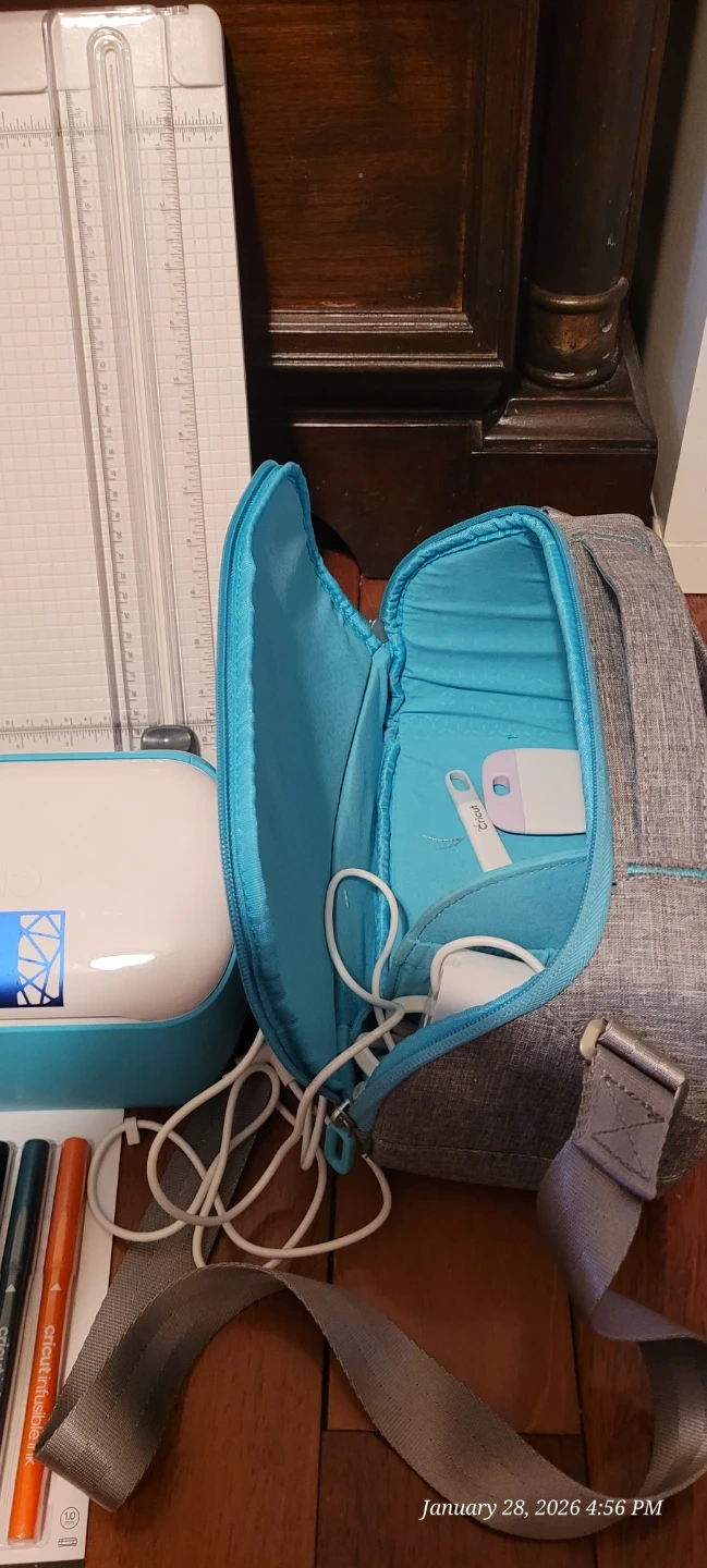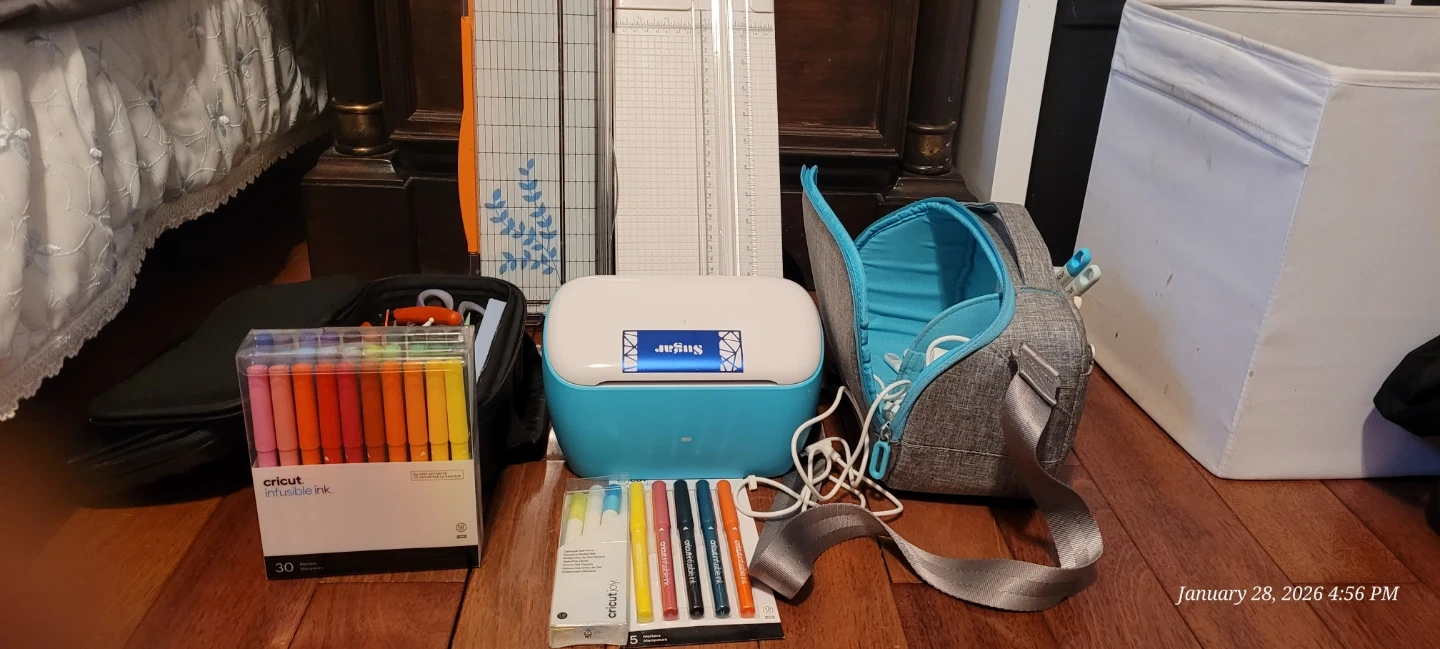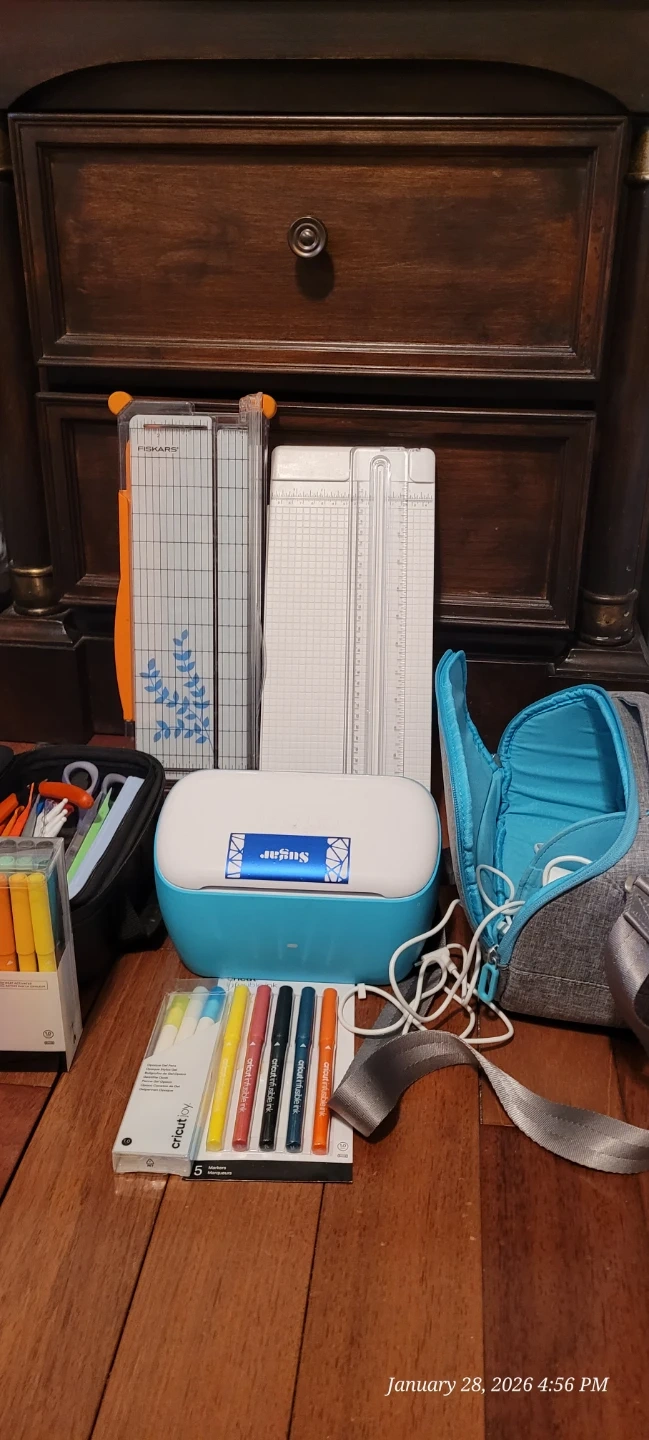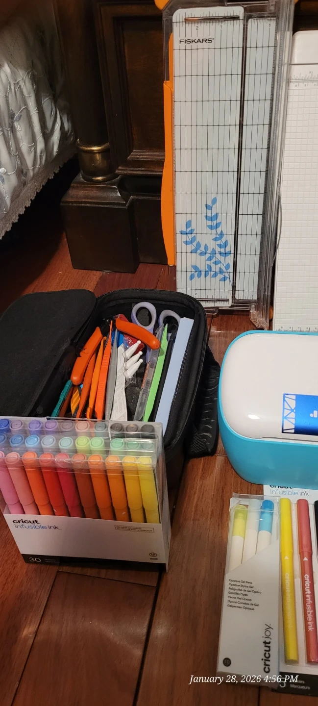 This set includes a Cricut Infusible Ink pen set with 30 pens, a portable Cricut heat press, and two paper cutters, one by Fiskars. It also comes with a black craft tool organizer and a blue storage bag with tools inside. Perfect for all your creative crafting needs!