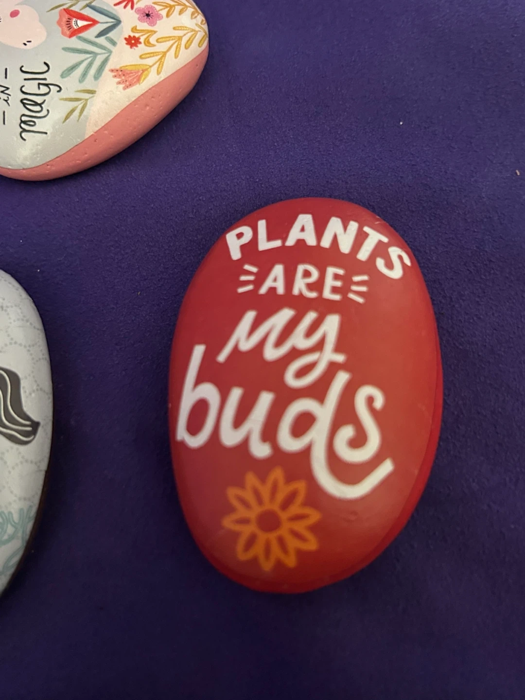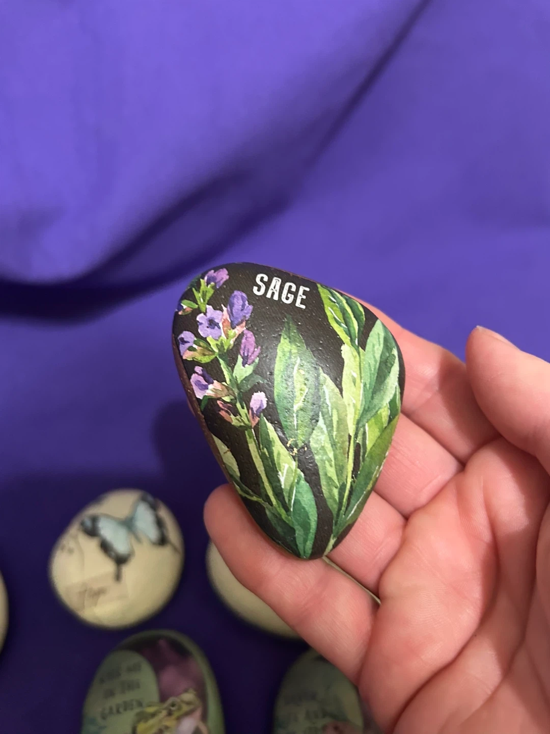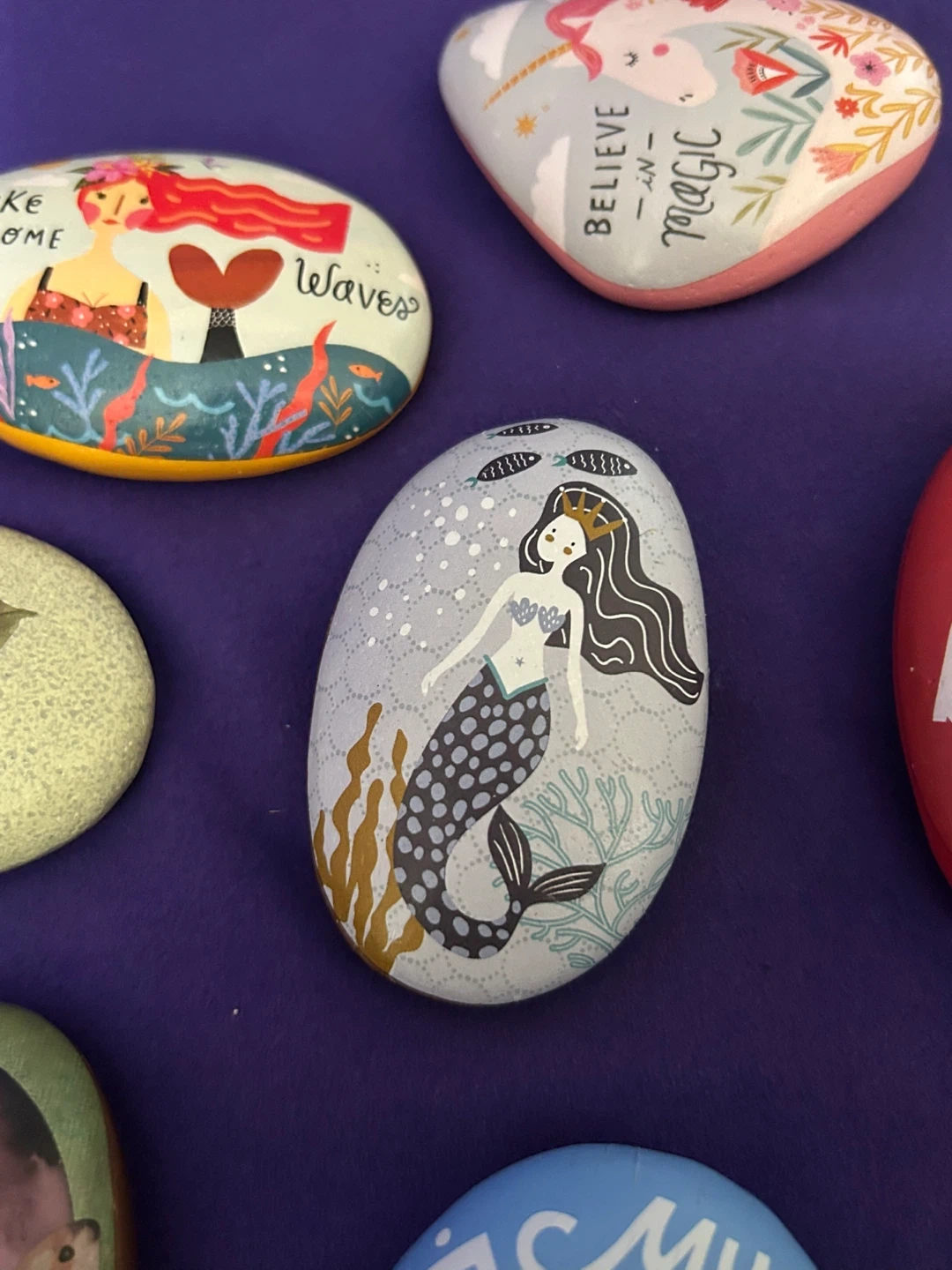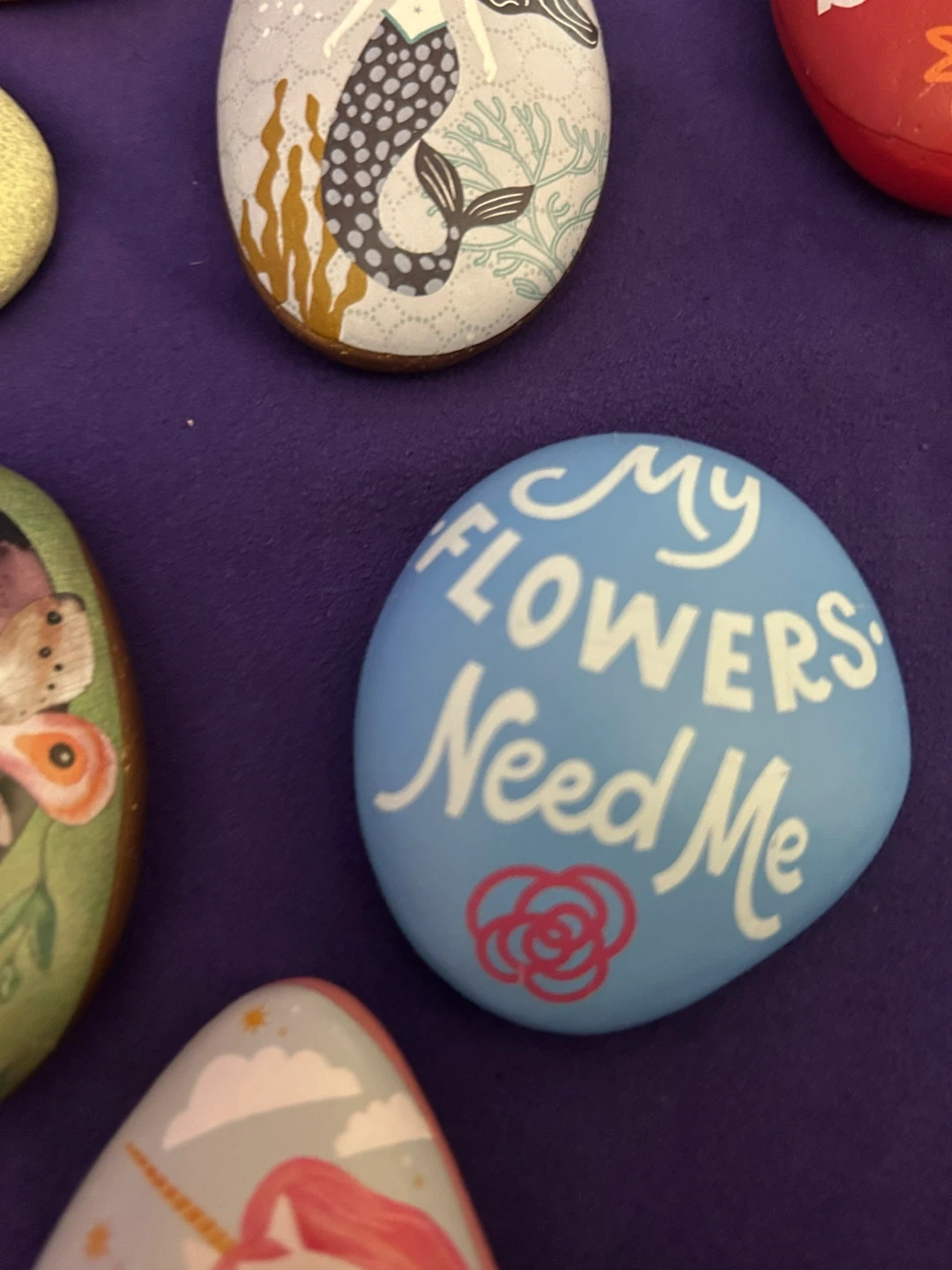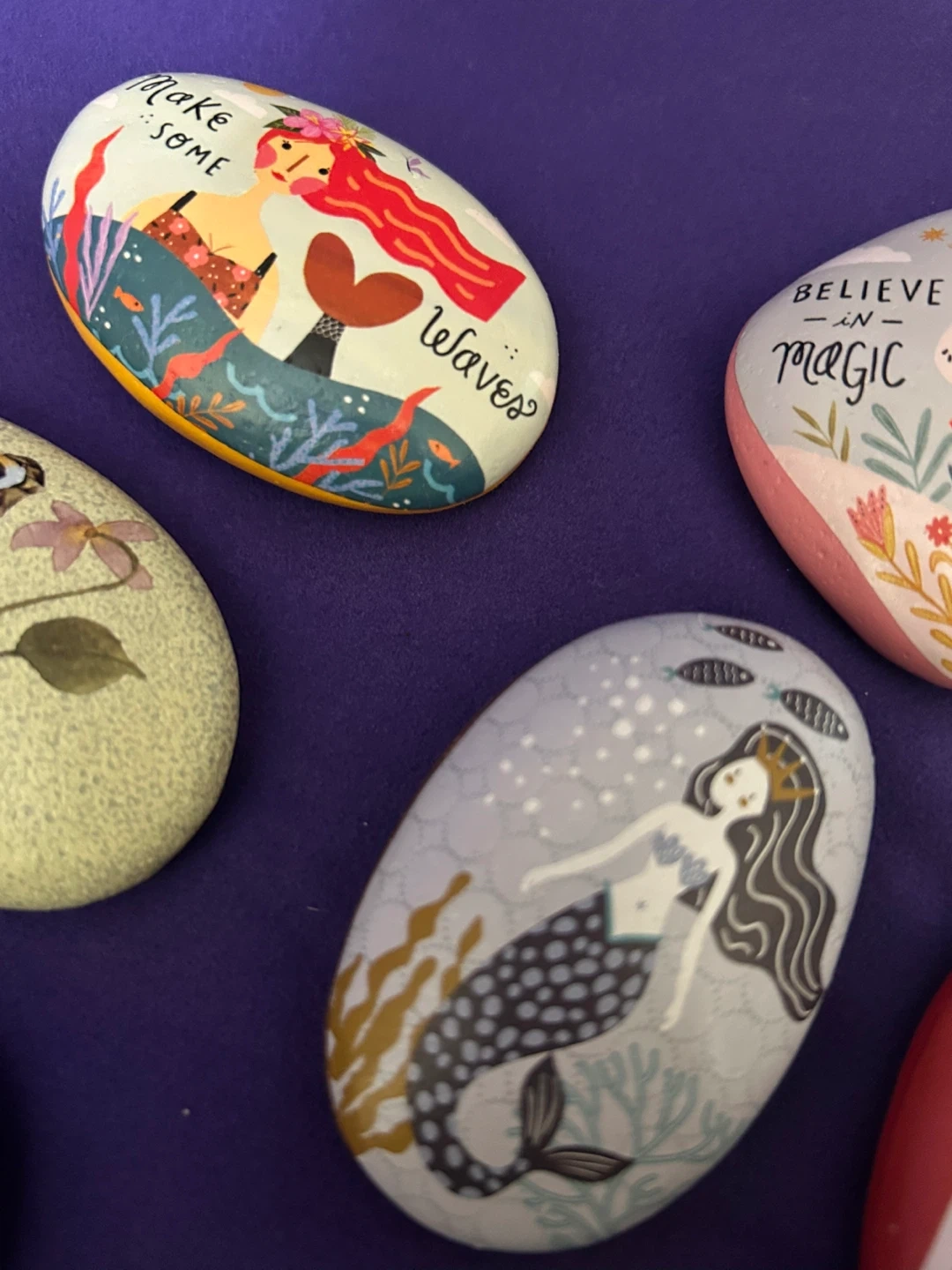 These decorative stones feature charming painted designs, including botanicals like sage and flowers, as well as whimsical scenes like mermaids and unicorns. They're perfect for adding a touch of magic or nature to your garden or home decor. Each rock is uniquely illustrated with positive messages or imagery.