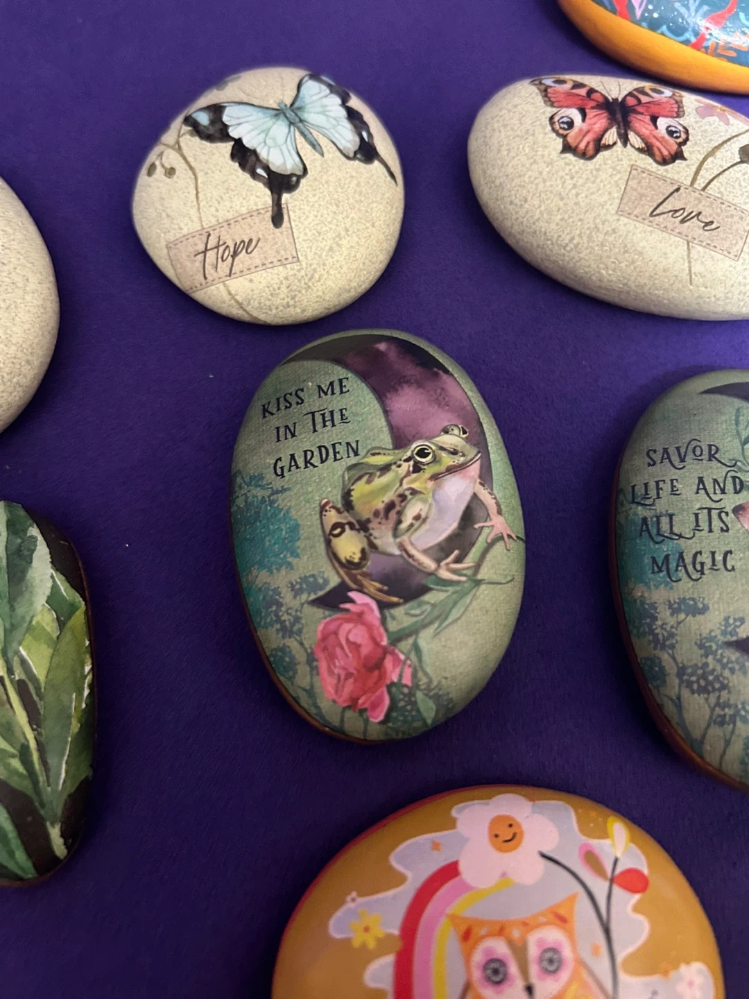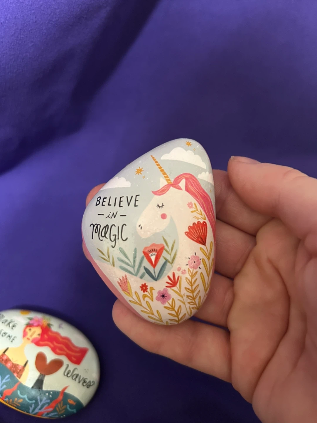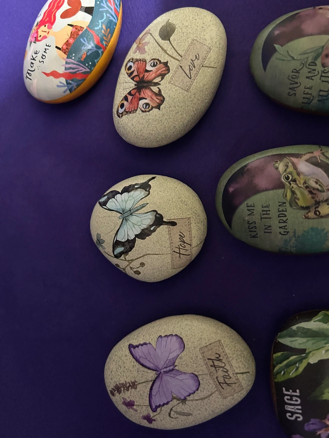 These decorative stones feature charming painted designs, including botanicals like sage and flowers, as well as whimsical scenes like mermaids and unicorns. They're perfect for adding a touch of magic or nature to your garden or home decor. Each rock is uniquely illustrated with positive messages or imagery.