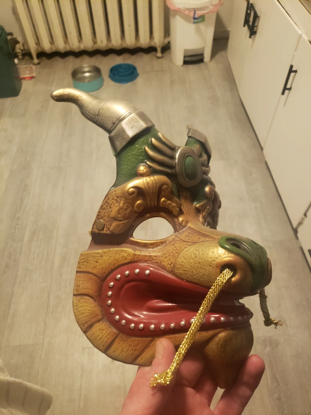 A decorative dragon mask from Cirque du Soleil. It features intricate gold and green detailing with a red mouth and yellow cords for hanging. This mask is a unique collectible.