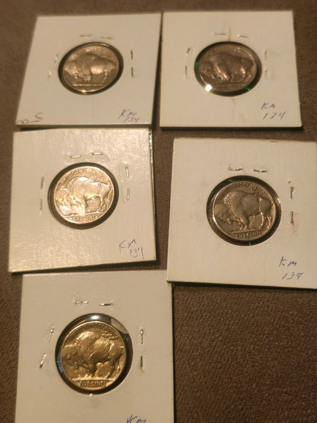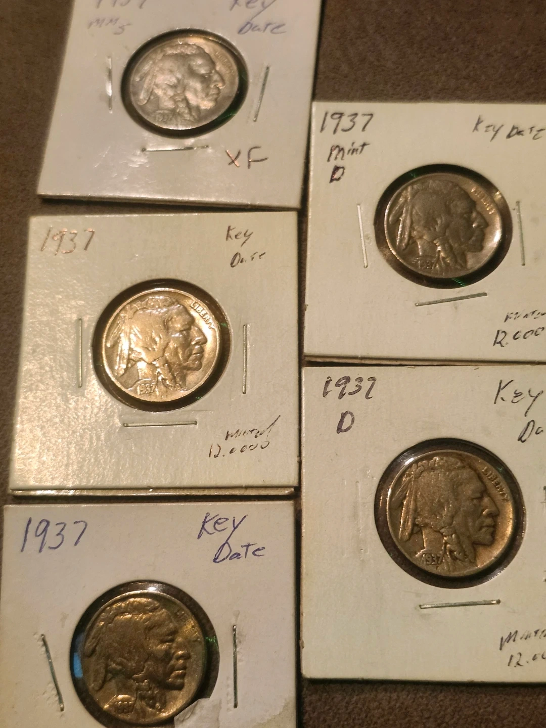 Collection of five Buffalo nickels, including key date examples from 1937. Some coins are in XF condition. Mint marks and dates are visible. This collection is great for coin enthusiasts and collectors seeking key date U.S. currency.