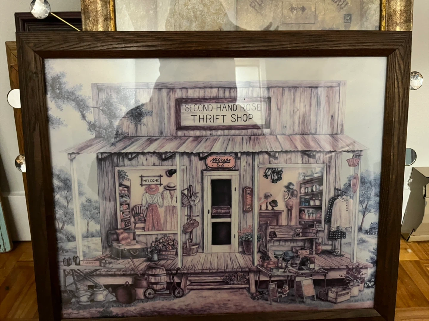This framed art print depicts a charming "Second Hand Rose Thrift Shop". It features detailed illustrations of clothing, hats, and various items displayed in and around the shop. The print is housed in a rustic wooden frame.