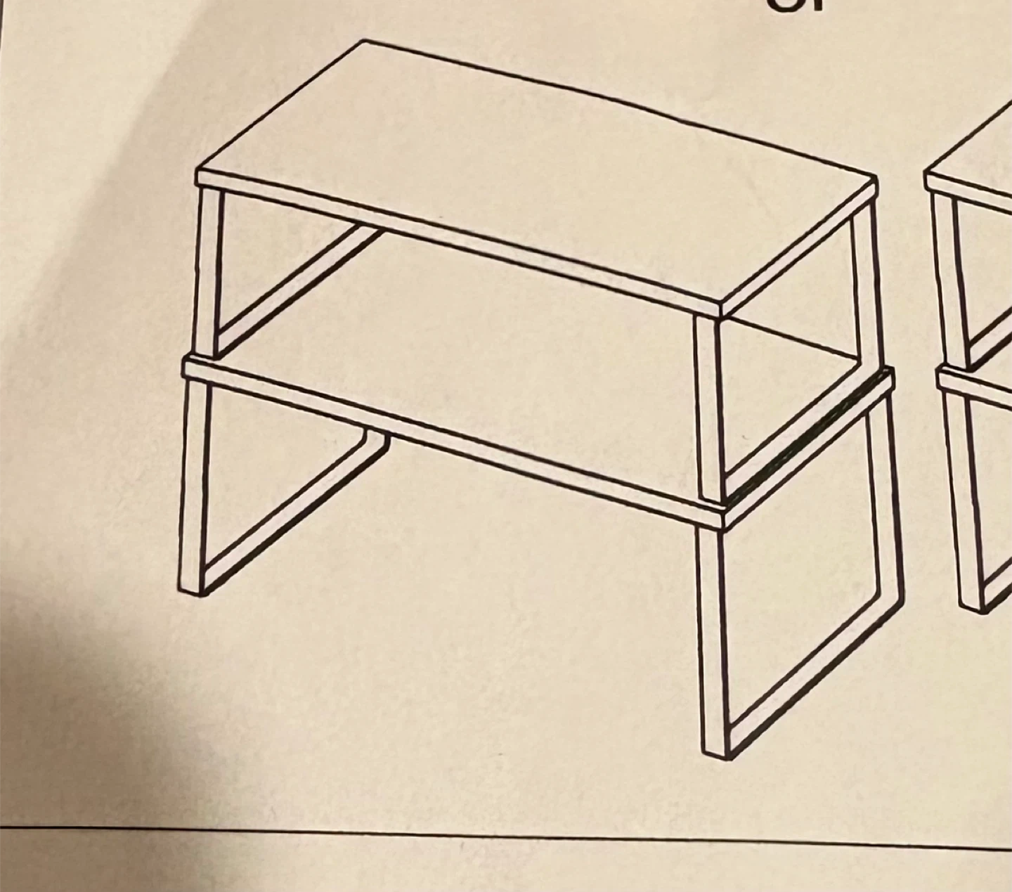 This is a two-tier shelf with a wood grain finish and black metal frame. It includes hardware for assembly. Perfect for storage or display!