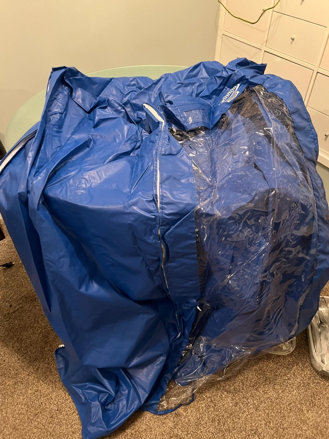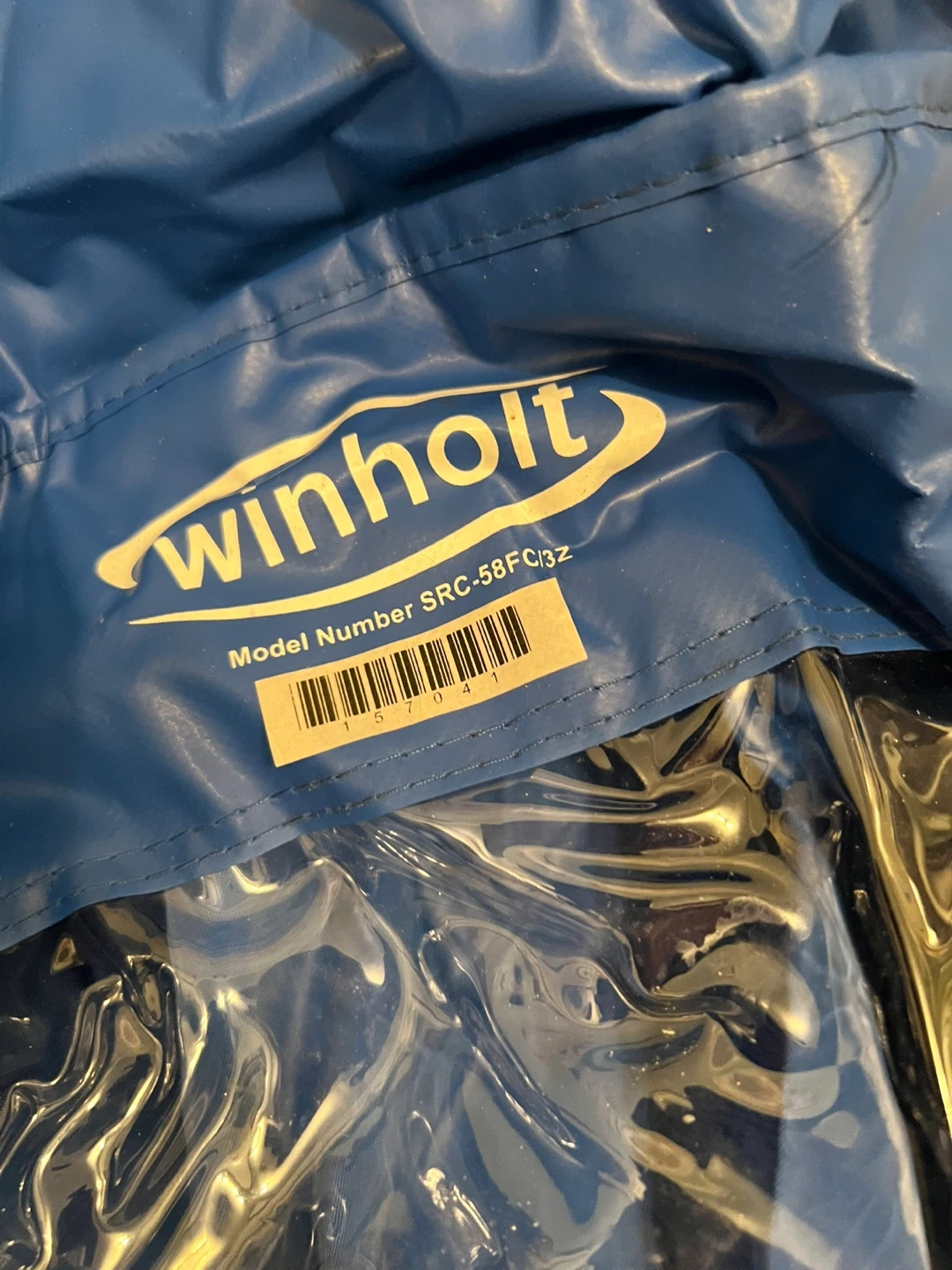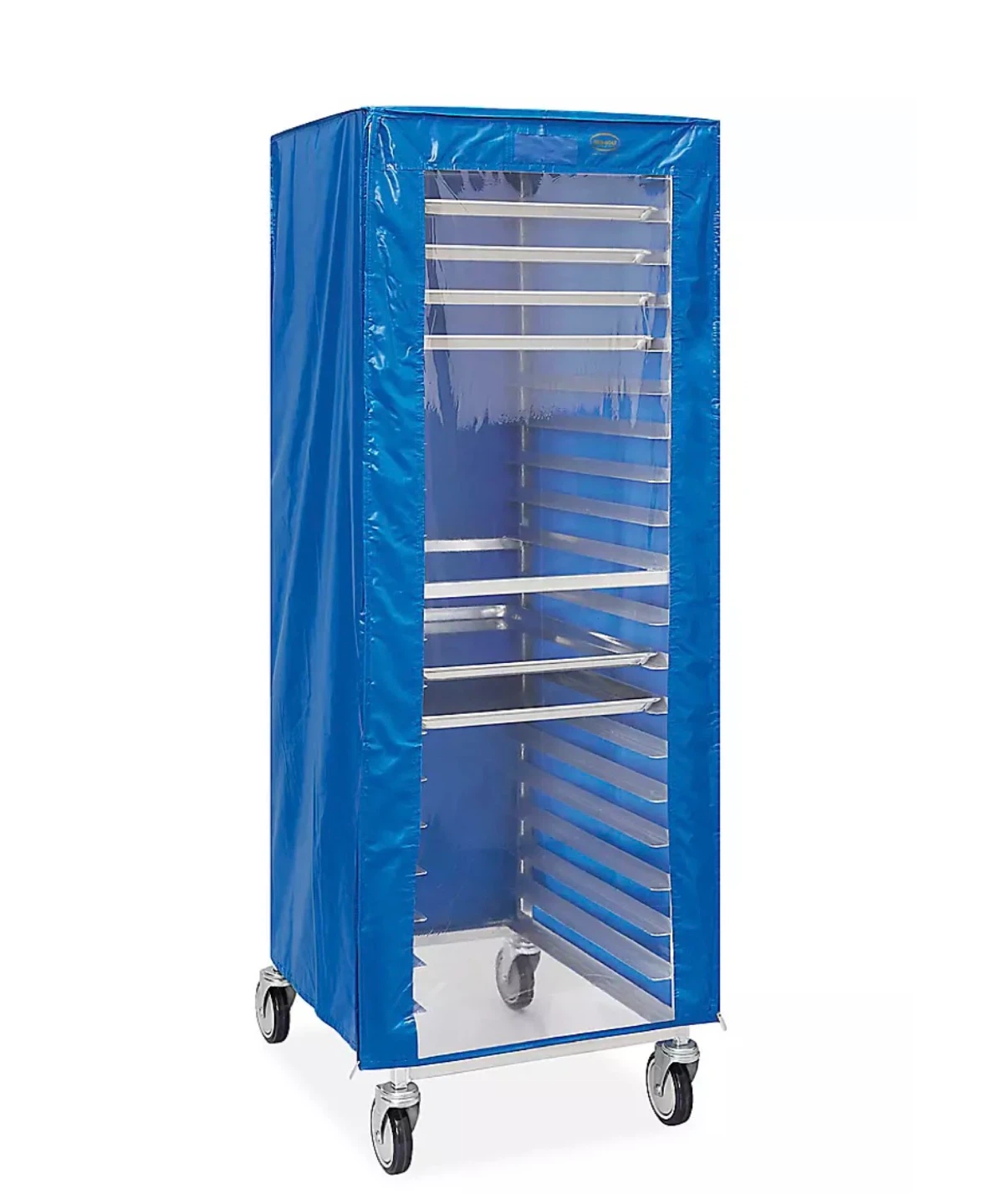 This is a blue rolling rack cover by Winholt. It's made of durable vinyl and features a clear window for visibility. The cover is designed to fit over standard rolling racks.