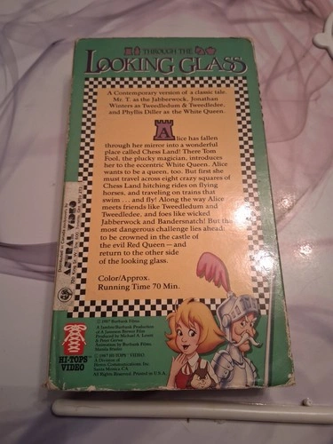 Dive into a fantastical world with the animated classic "Through the Looking Glass" on VHS. Presented by Hi-Tops Video, this tape offers a delightful viewing experience for fans of animation and anime genres. The language of the audio is English. This VHS tape brings the whimsical adventures of Lewis Carroll's beloved characters to life. It's a perfect addition to any collector's library or a thoughtful gift for those who cherish the magic of classic animation. Uncover the wonder and enchantment of "Through the Looking Glass" with this charming VHS edition.