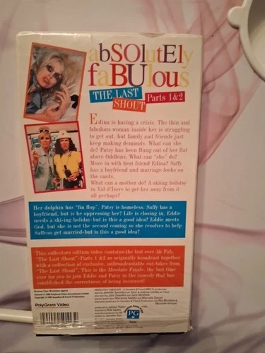 Delve into the hilarious world of "Absolutely Fabulous" with this classic VHS tape. Brought to you by PolyGram Video, it offers a nostalgic viewing experience of one of the most beloved sitcoms of the '90s. Perfect for collectors and fans alike, this tape captures the essence of the iconic British series. Relive the antics of Patsy Stone and Edina Monsoon as they navigate the highs and lows of fashion and friendship. Whether you're revisiting the series or discovering it for the first time, this VHS tape is a delightful addition to any movie library, especially for those who appreciate the charm of vintage TV.