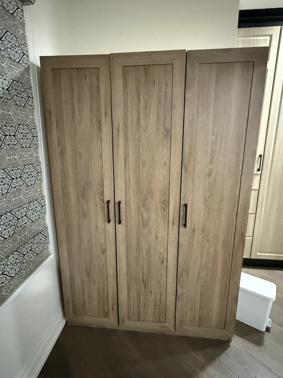 This is a three-door wardrobe with a light wood grain finish. It offers ample storage space with shelves and a hanging rod. Perfect for organizing clothing and accessories.