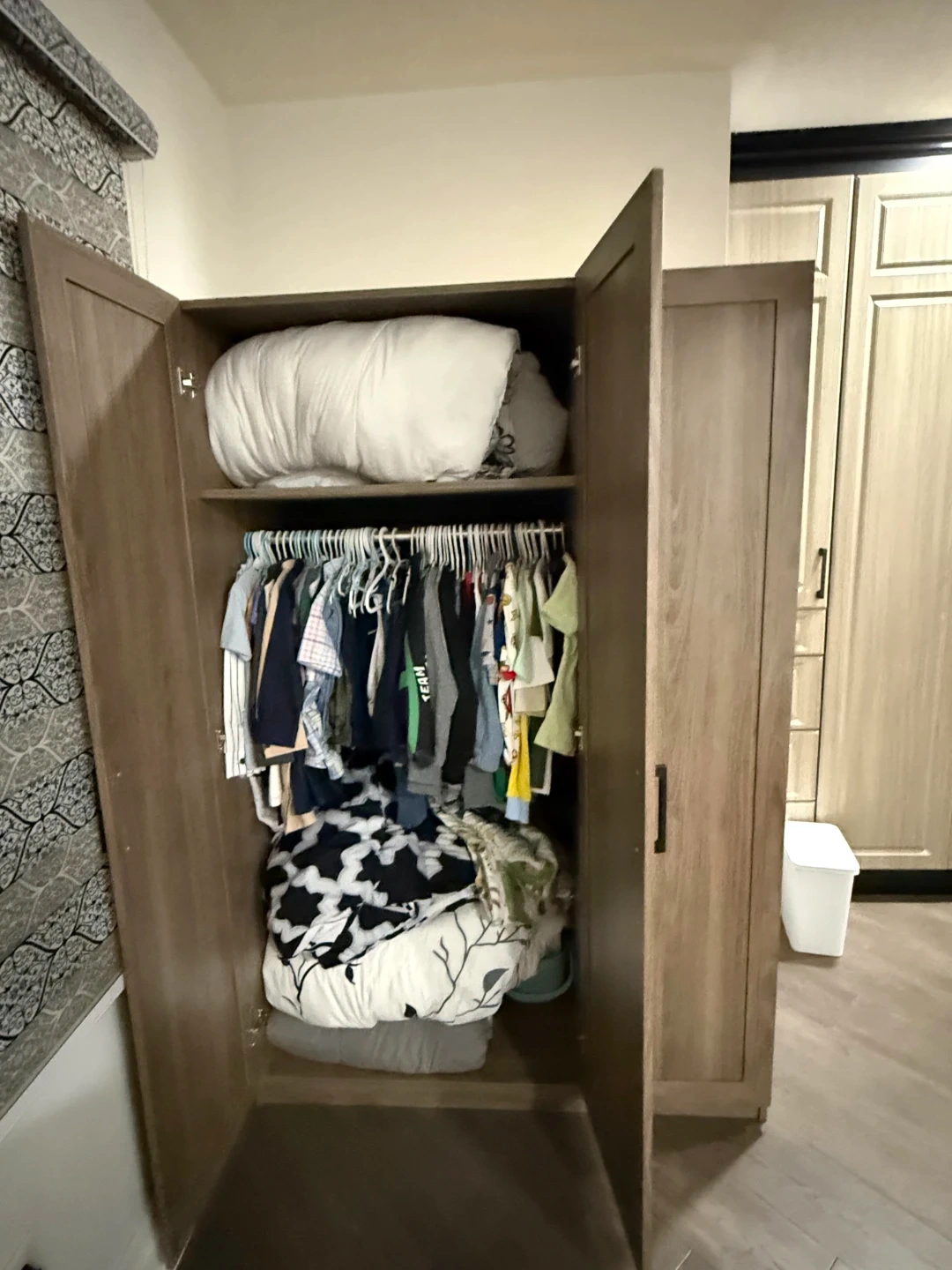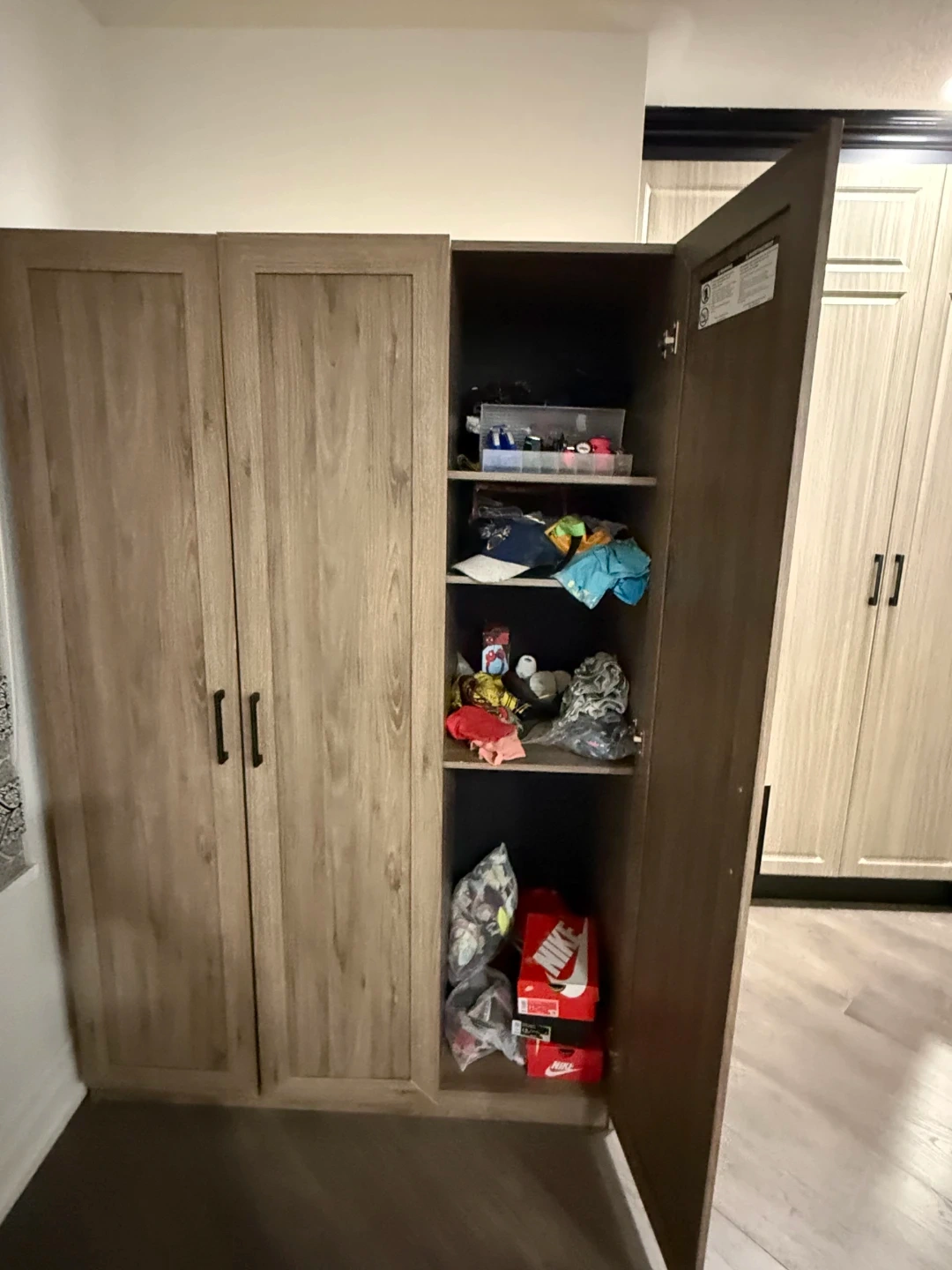 This is a three-door wardrobe with a light wood grain finish. It offers ample storage space with shelves and a hanging rod. Perfect for organizing clothing and accessories.