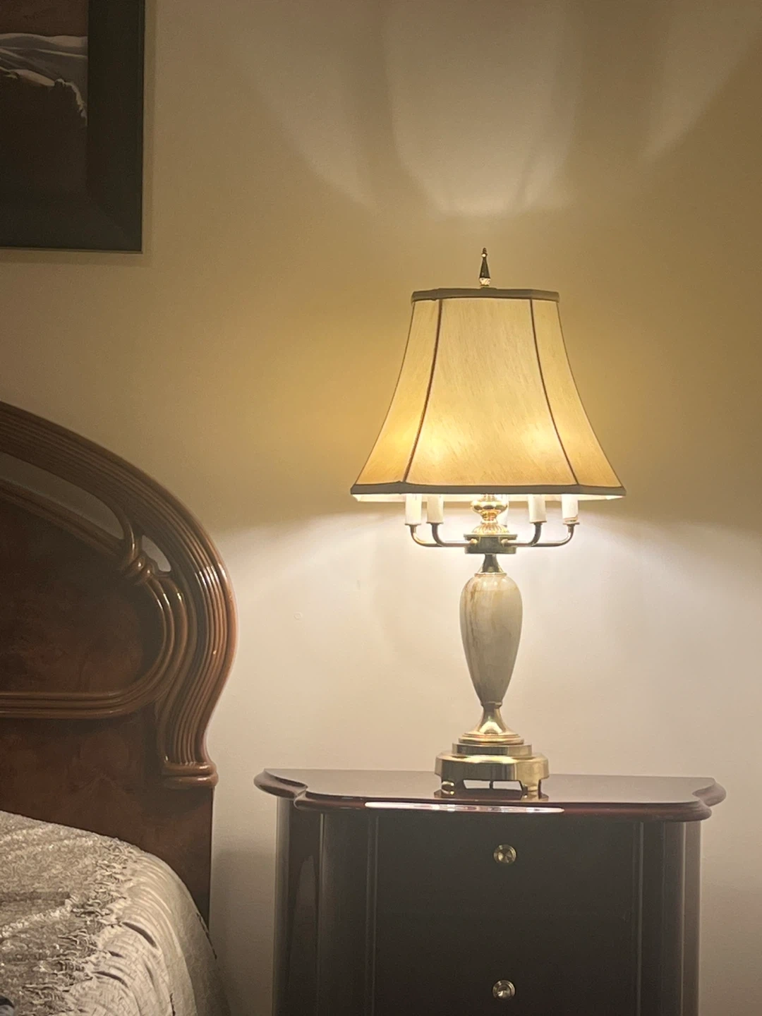 Beautiful table lamp with a unique onyx stone base and brass accents. It provides a warm, ambient light, perfect for a bedroom or living room. The lamp features a classic design and a fabric shade.