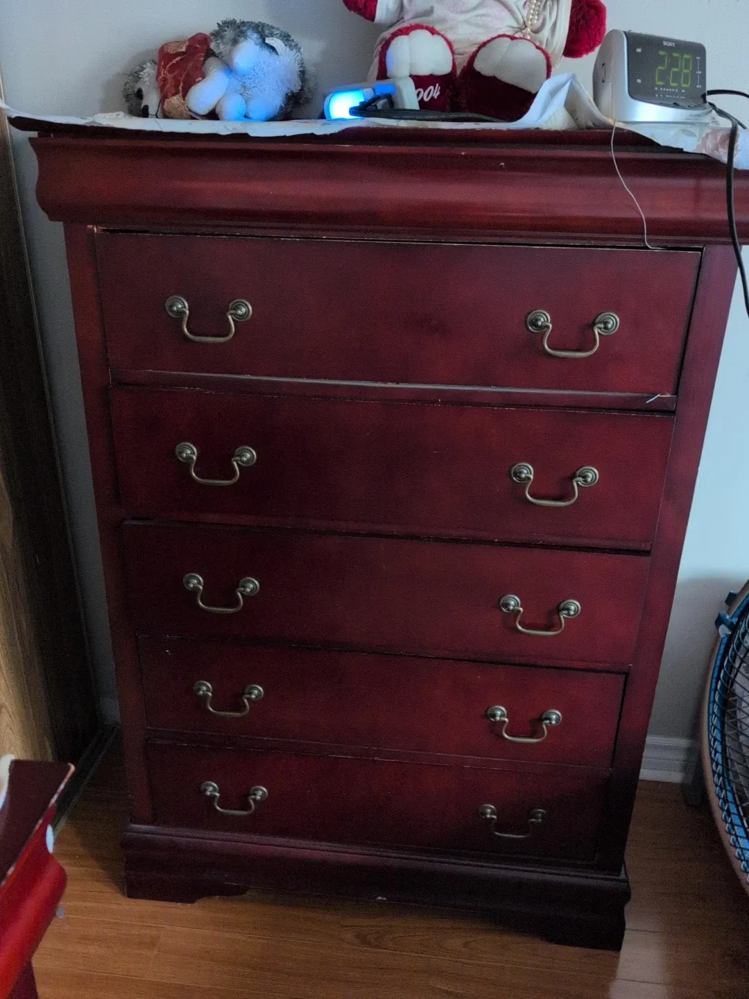 A dark red dresser with five drawers. It features brass-coloured drawer pulls. This dresser offers ample storage space for clothing or linens.