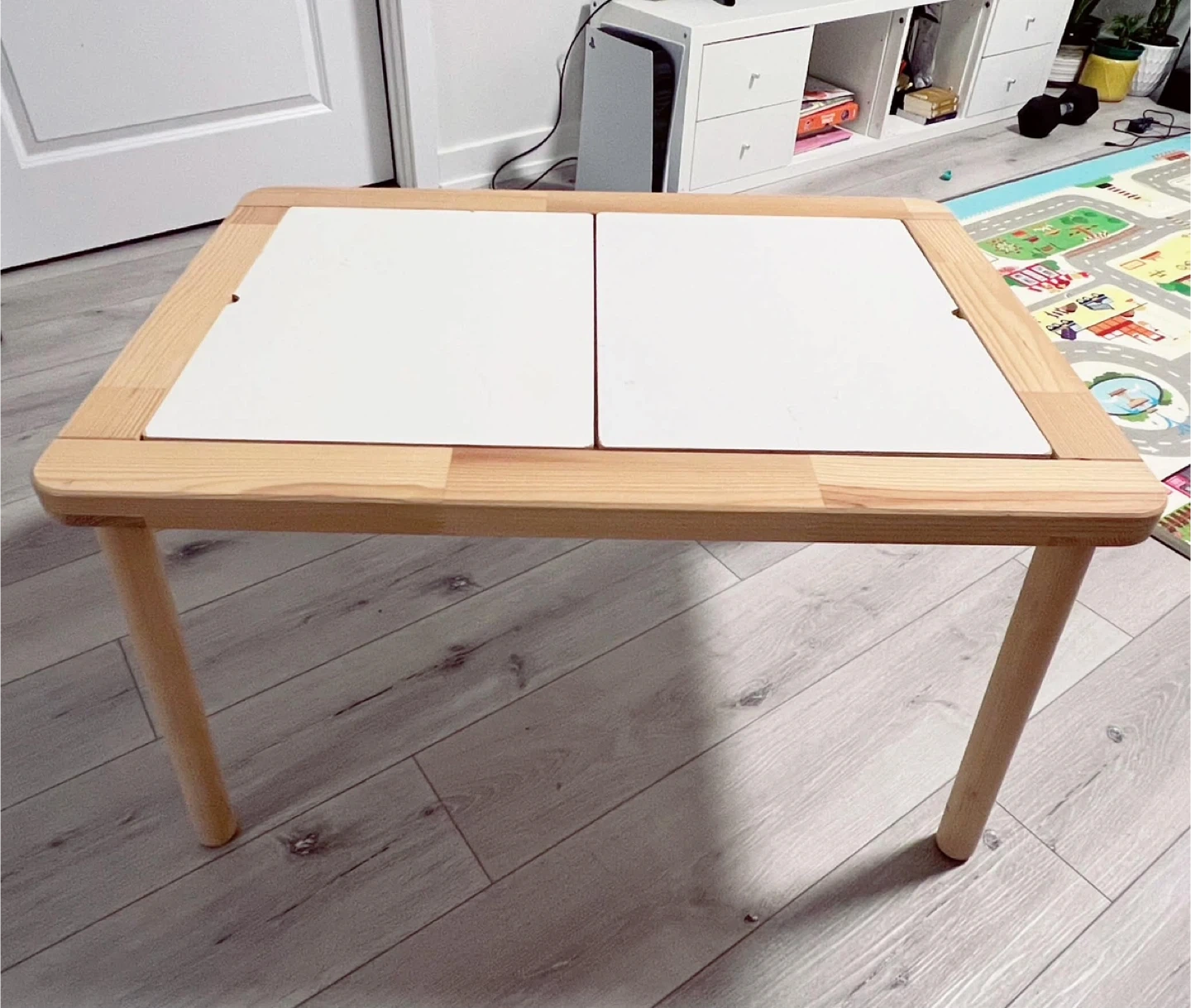 IKEA FLISAT children’s table in very good used condition. Clean, sturdy, and well maintained. Natural solid wood frame with two removable white tabletop panels — great for crafts, drawing, playtime, or sensory activities.