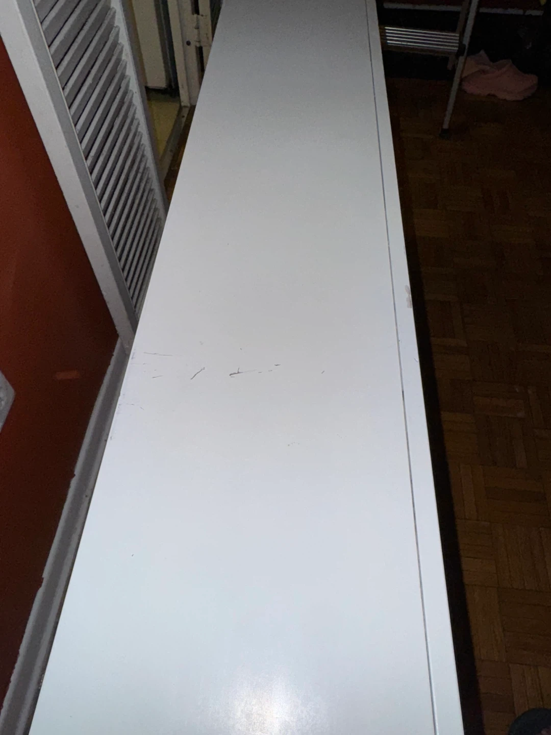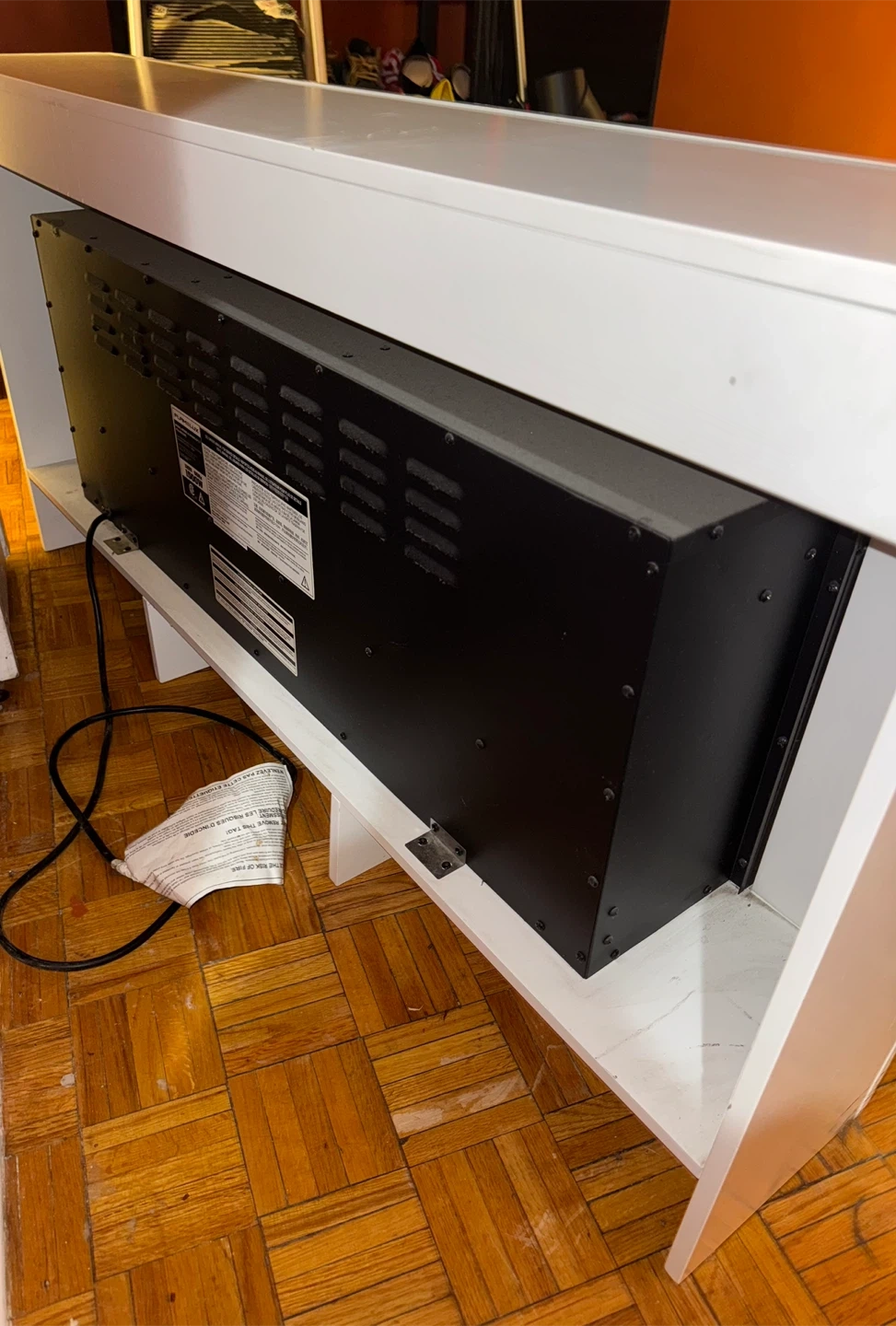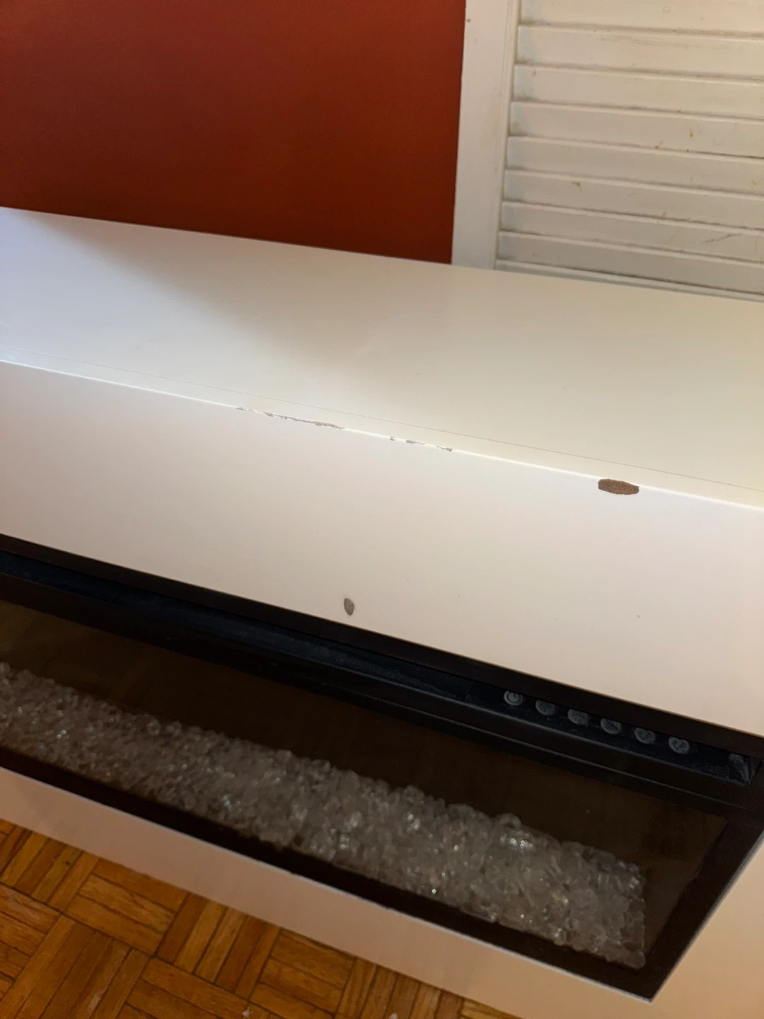 Electric fireplace w/ a realistic flame effect and decorative glass piece. White finish has some scuffs that may be painted over? Second middle leg from the right has a slight wobble but can be tightened if flipped over (I cannot do this myself)