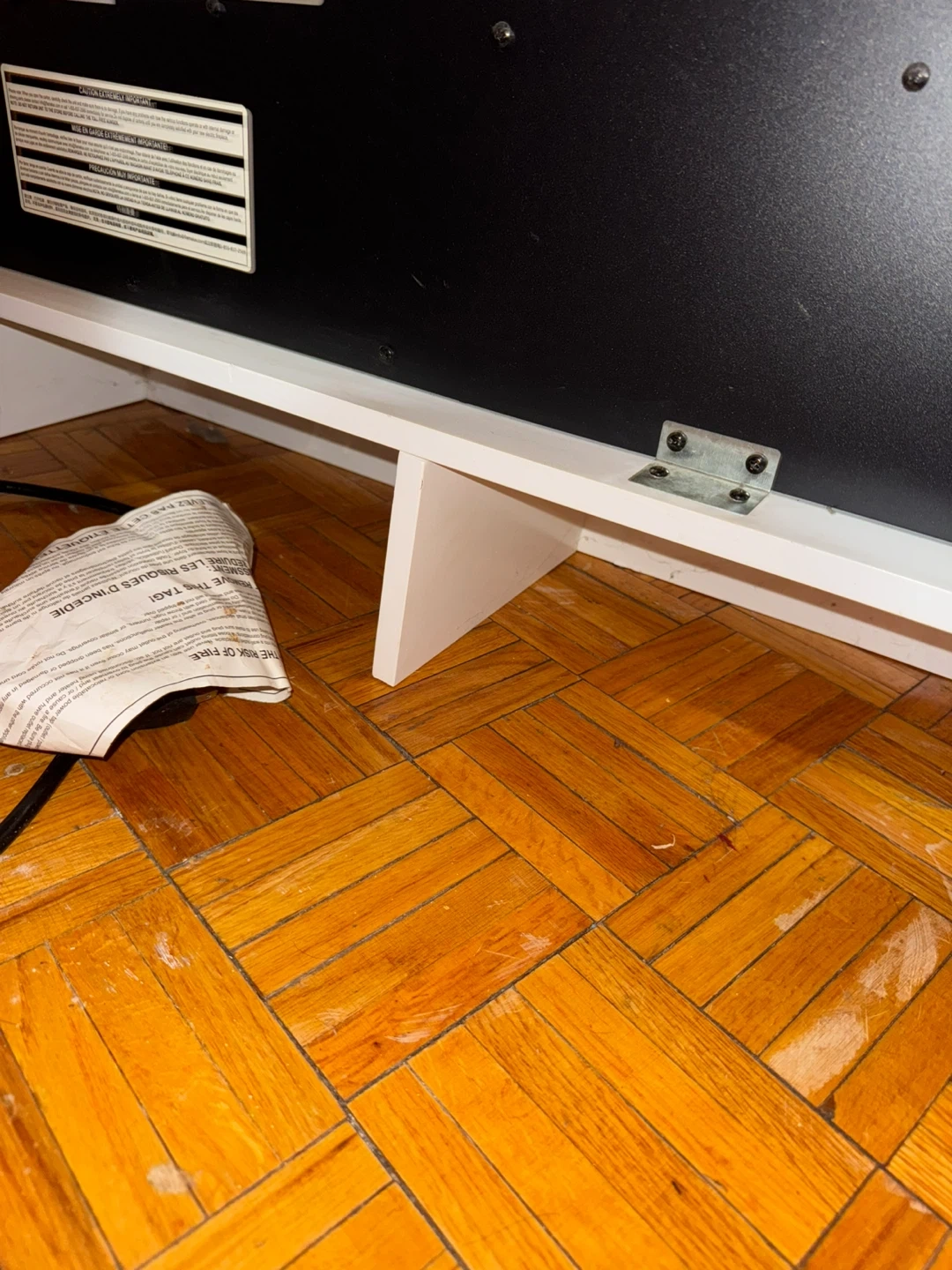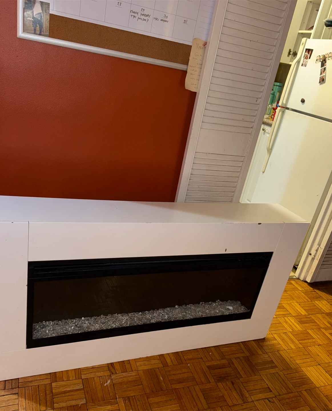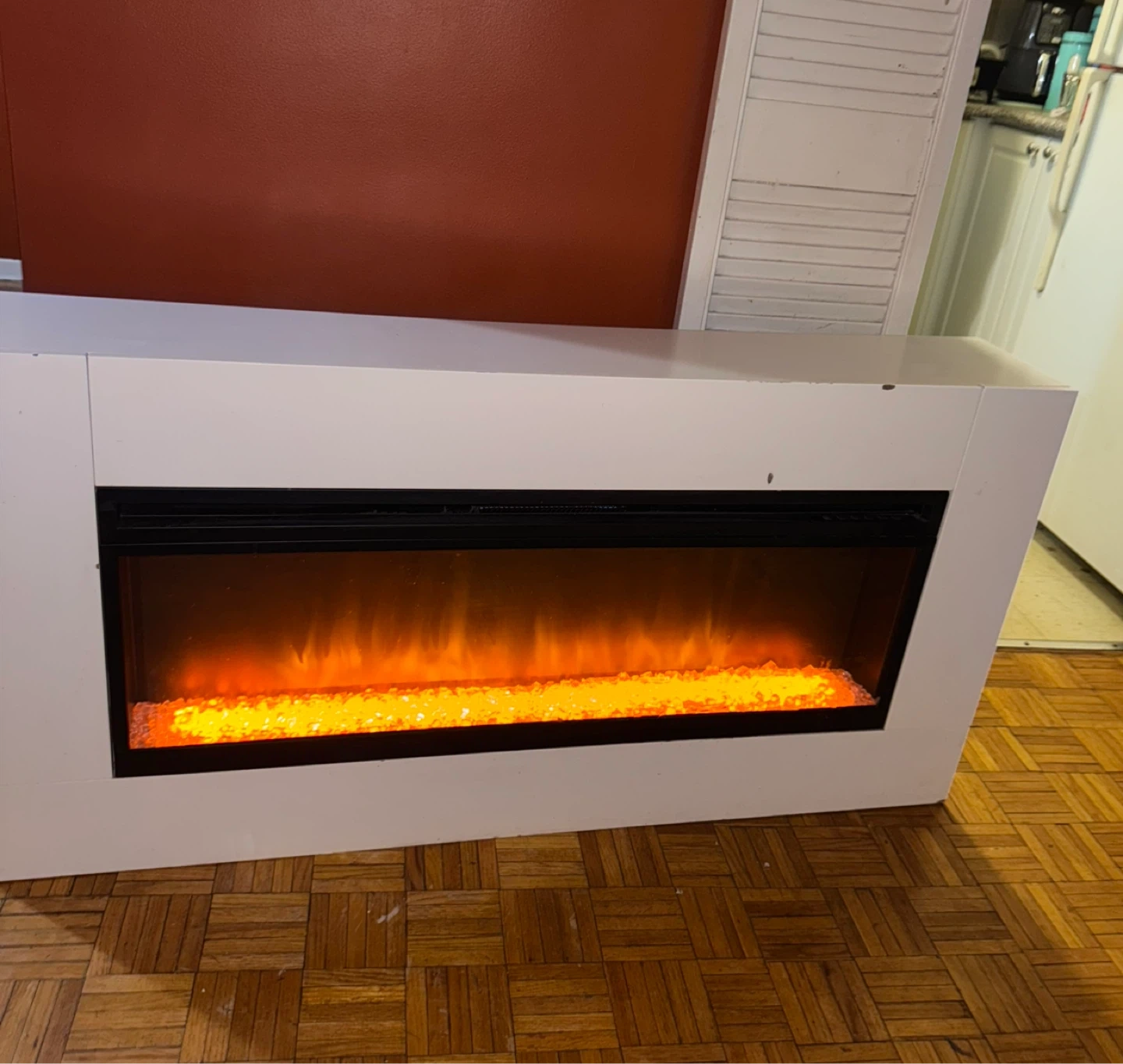 Electric fireplace w/ a realistic flame effect and decorative glass piece. White finish has some scuffs that may be painted over? Second middle leg from the right has a slight wobble but can be tightened if flipped over (I cannot do this myself)