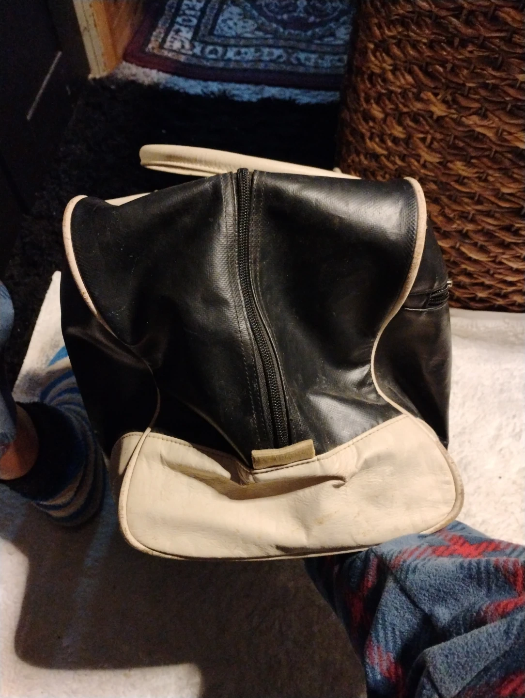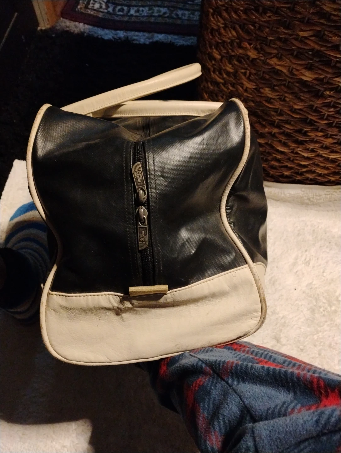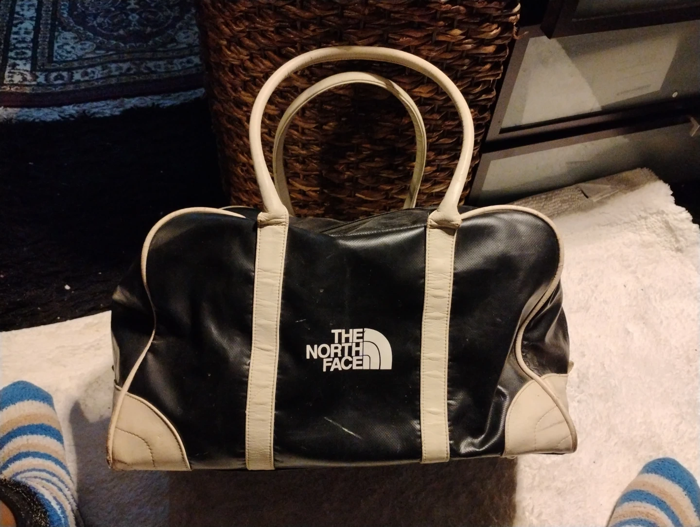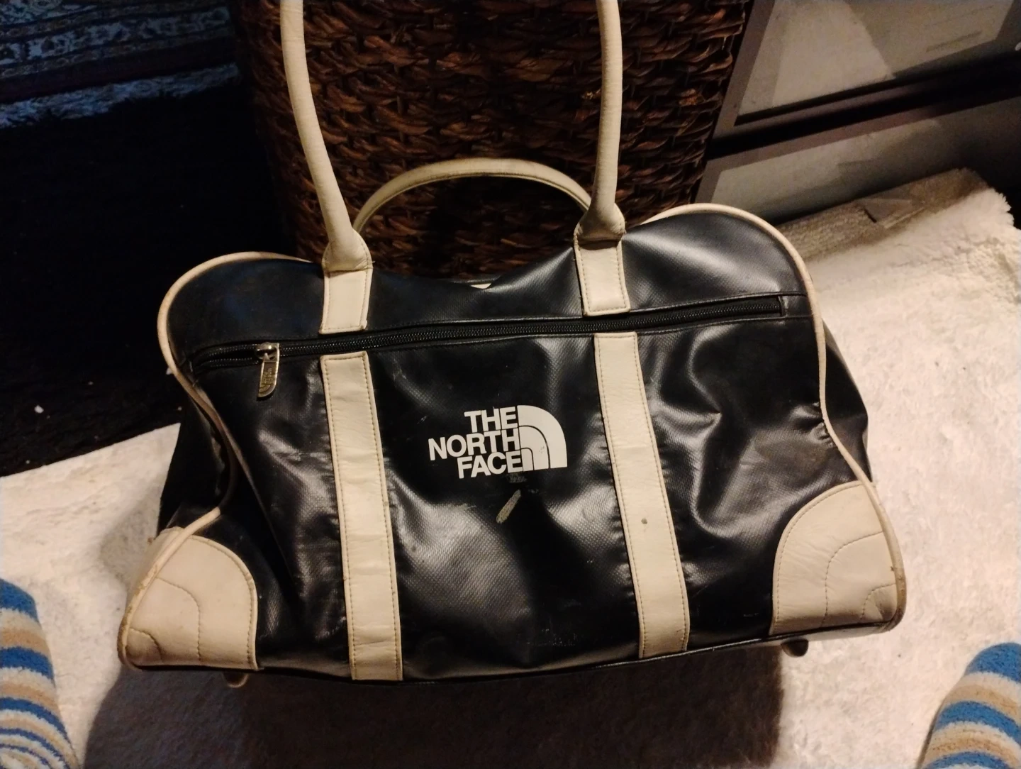 This is a black and cream duffel bag from The North Face. It features dual handles and a zippered main compartment. The material appears to be durable and water-resistant.