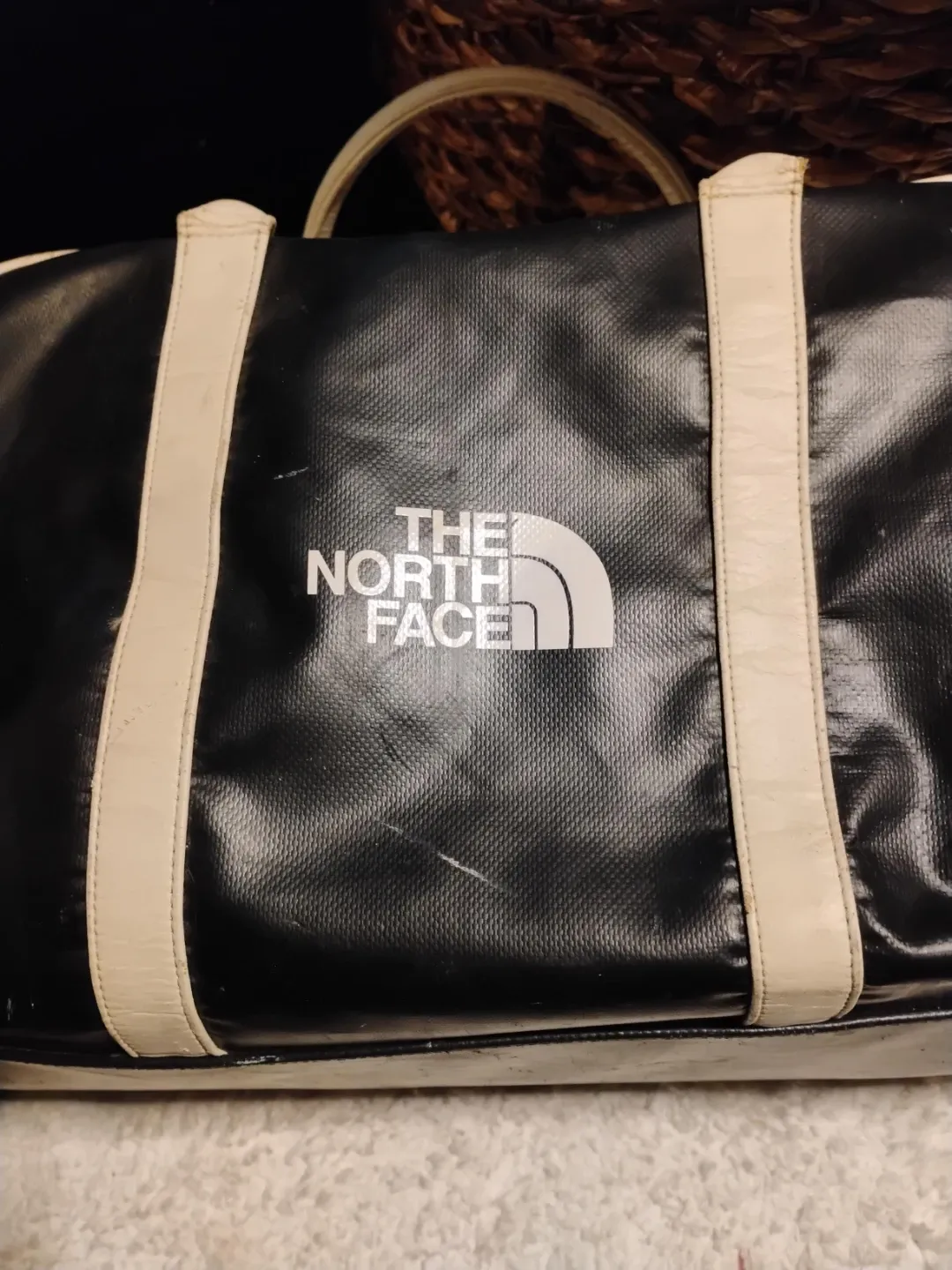 This is a black and cream duffel bag from The North Face. It features dual handles and a zippered main compartment. The material appears to be durable and water-resistant.