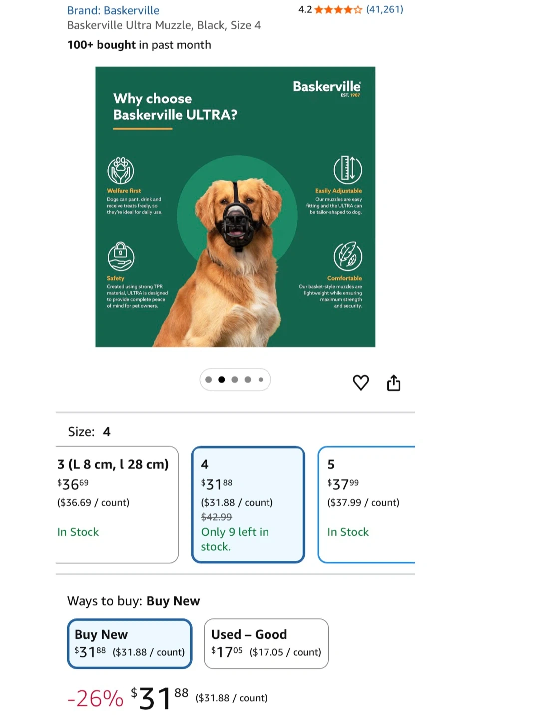 This is a Baskerville Ultra muzzle in black, size 4. It's made from strong, lightweight TPR material. The muzzle is designed for safety and comfort, with an easily adjustable fit. This muzzle is suitable for dogs that need to be prevented from eating things off the ground.