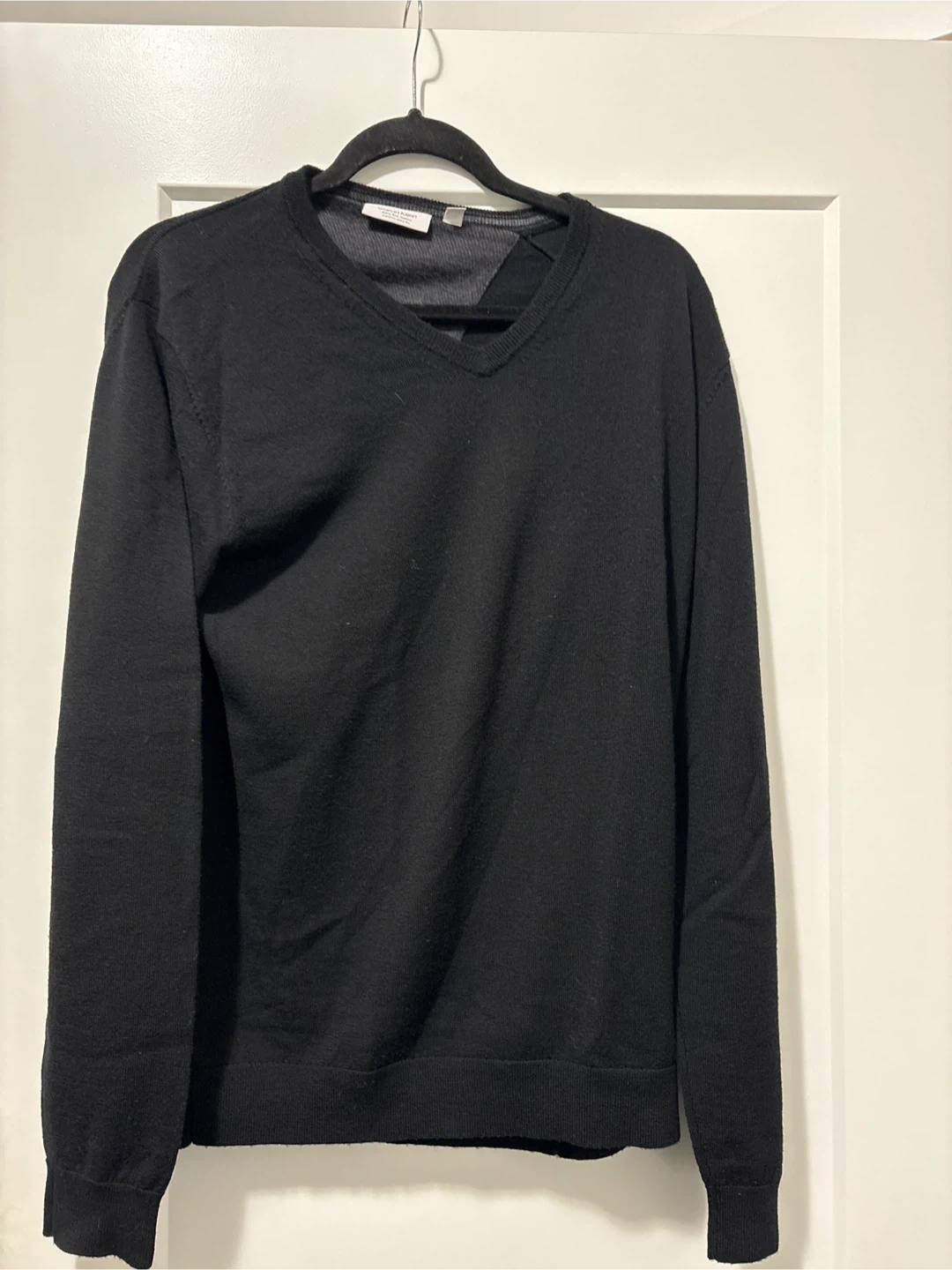 This is a classic black V-neck sweater from Calvin Klein. It's made from a soft knit material. It's suitable for layering or wearing on its own.