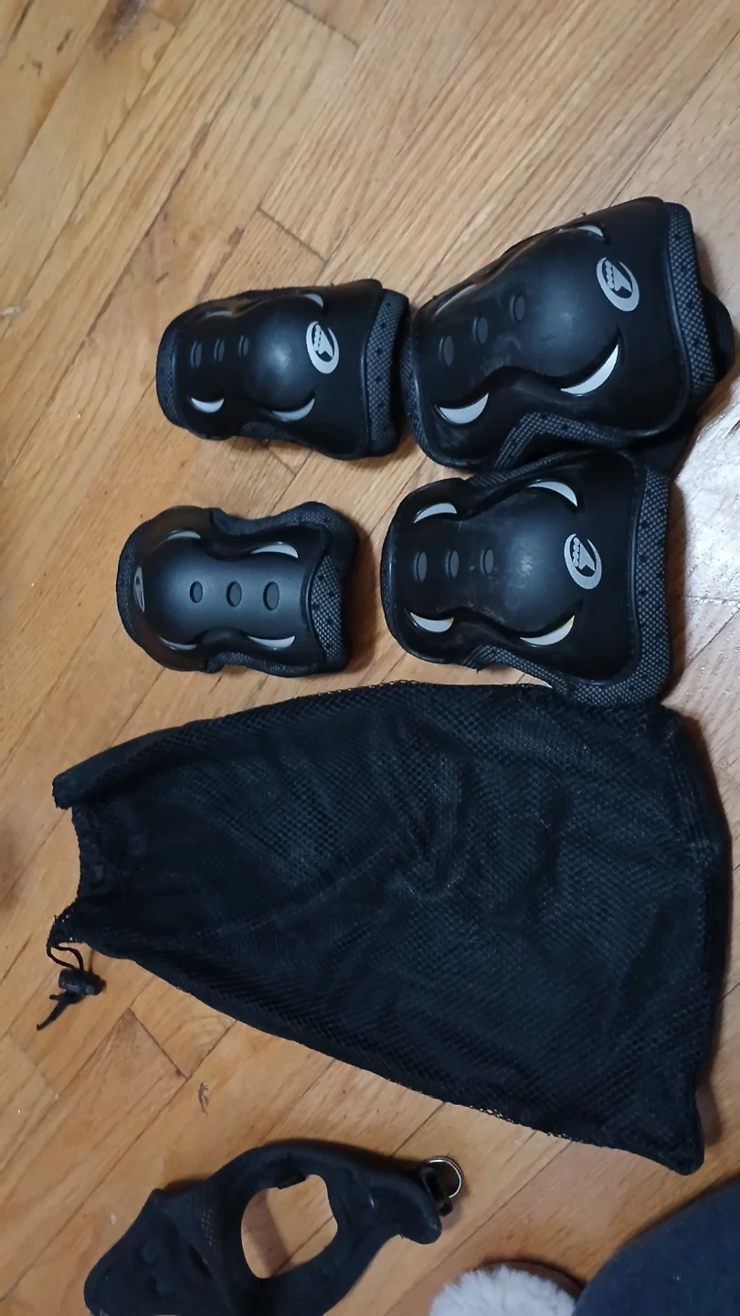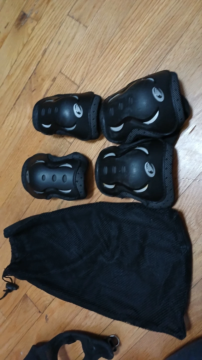 This set includes knee pads and elbow pads for protection. They're black with a white logo detail. A drawstring bag is included for storage.