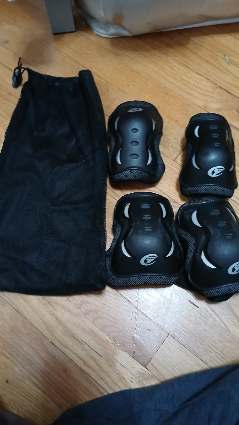 This set includes knee pads and elbow pads for protection. They're black with a white logo detail. A drawstring bag is included for storage.