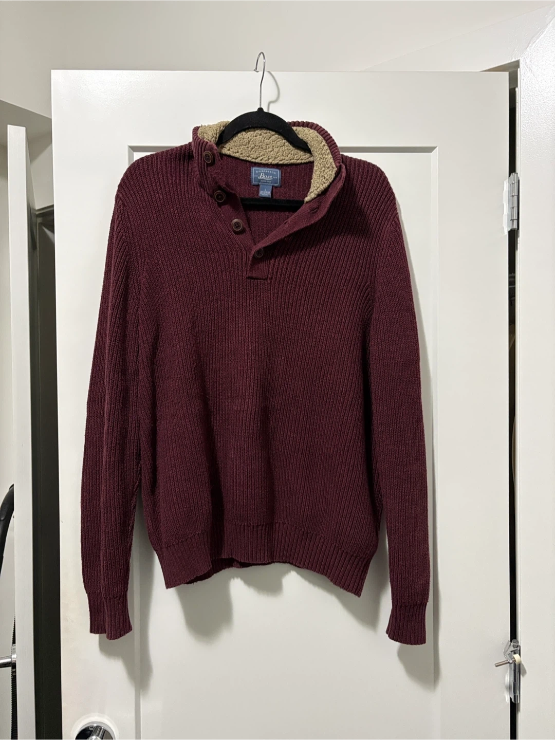 This G.H. Bass & Co. pullover sweater is a cozy burgundy knit with a comfortable sherpa-lined collar. It features a four-button placket at the neck for adjustable warmth. It's a great casual piece for cooler weather!