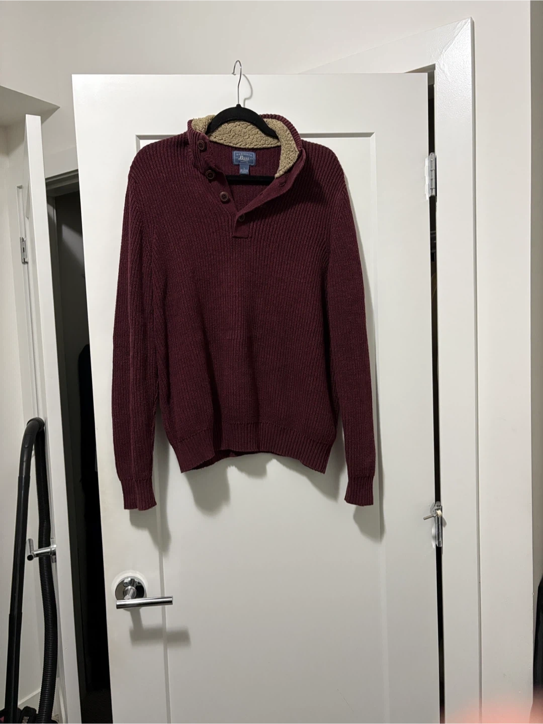 This G.H. Bass & Co. pullover sweater is a cozy burgundy knit with a comfortable sherpa-lined collar. It features a four-button placket at the neck for adjustable warmth. It's a great casual piece for cooler weather!