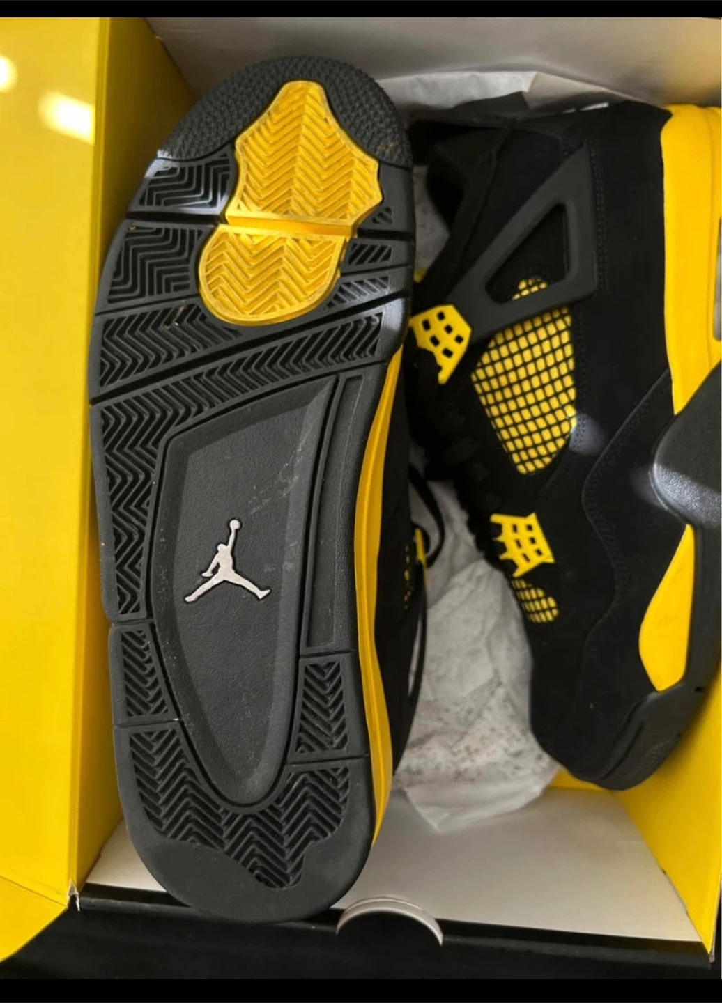 These Jordan 4 "Lightning" sneakers are black with vibrant yellow accents. They come in their original box. These kicks are perfect for sneakerheads looking to add a bold colourway to their collection!