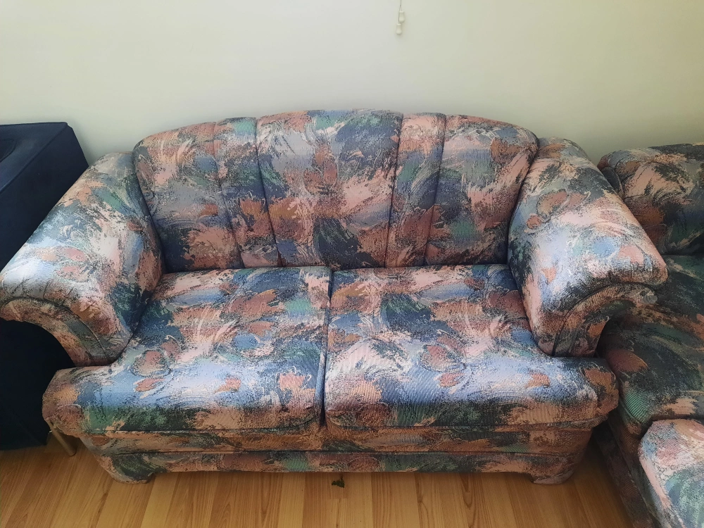 This is a loveseat couch featuring an abstract floral pattern in shades of blue, pink, and green. It offers comfortable seating. The couch has a classic design with curved armrests.
