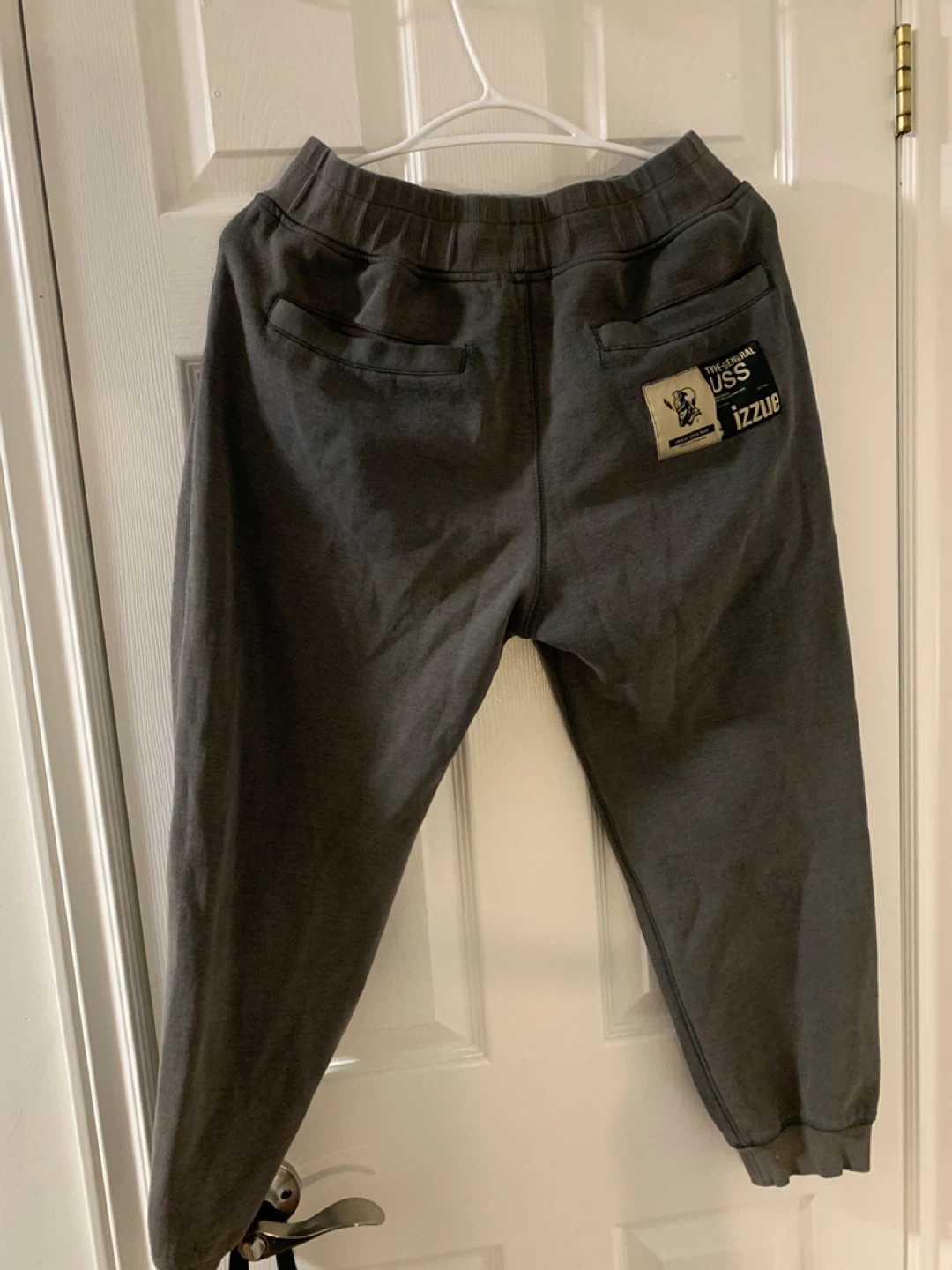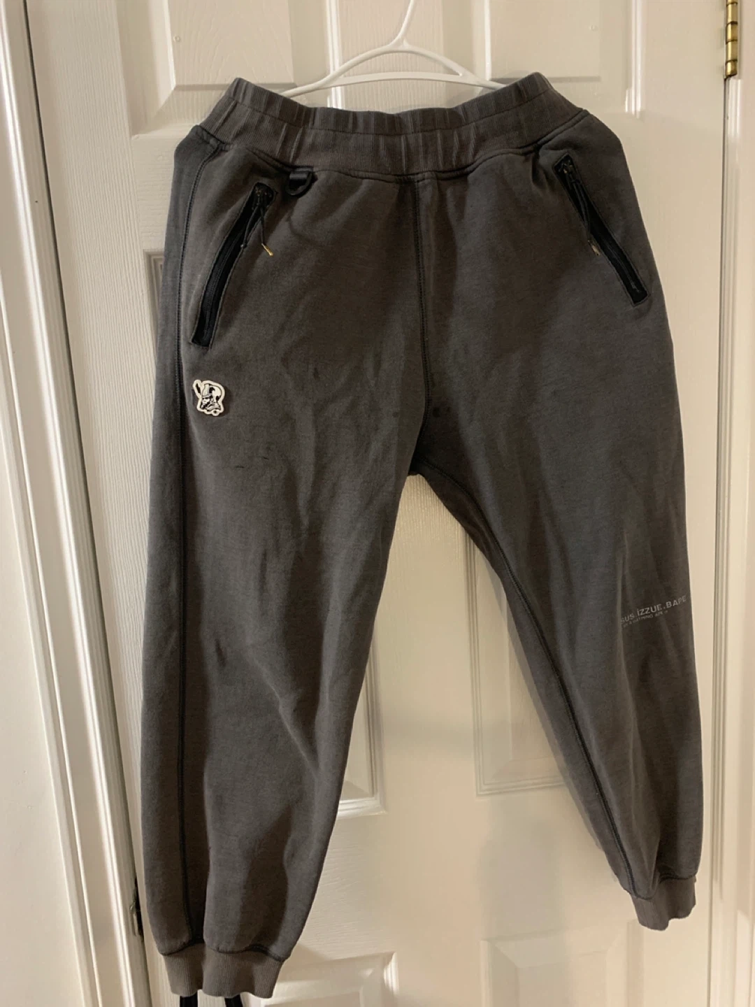 These BAPE sweatpants are charcoal grey and feature the URSUS logo. They're a size small. Includes zippered pockets.