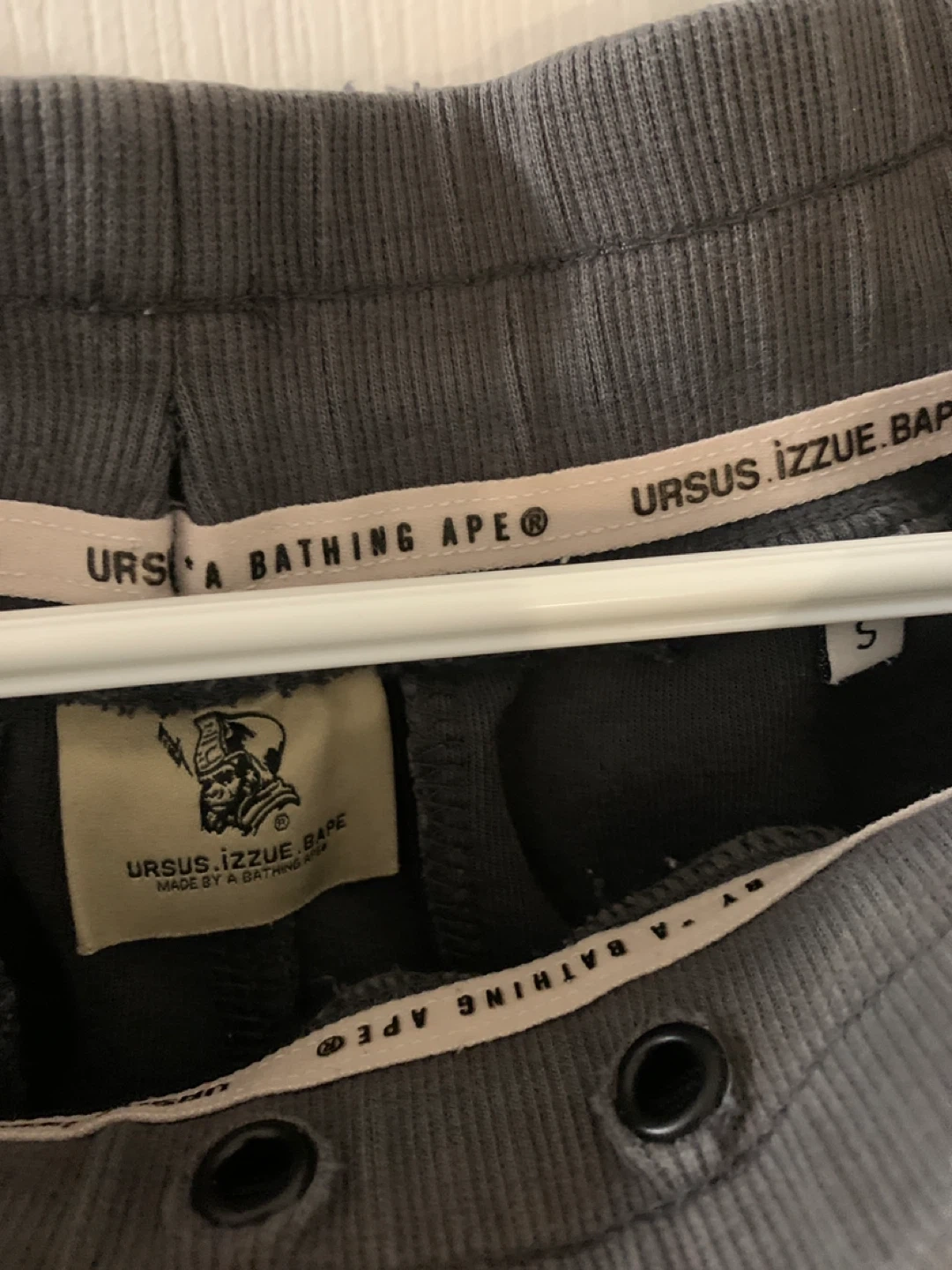 These BAPE sweatpants are charcoal grey and feature the URSUS logo. They're a size small. Includes zippered pockets.