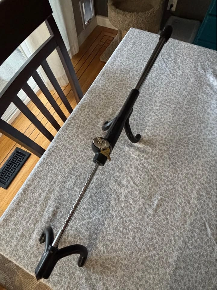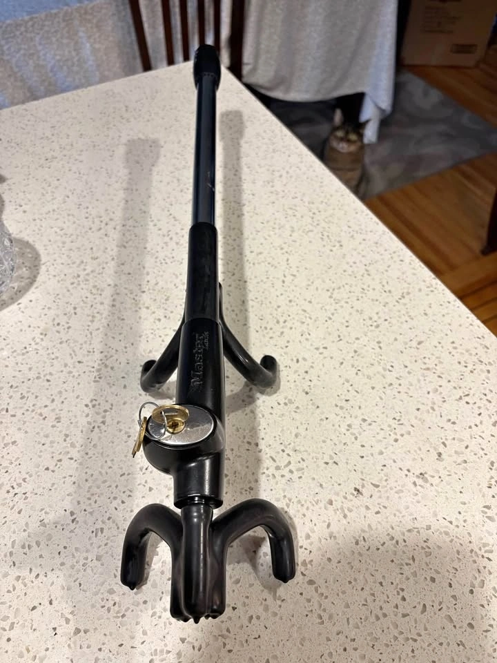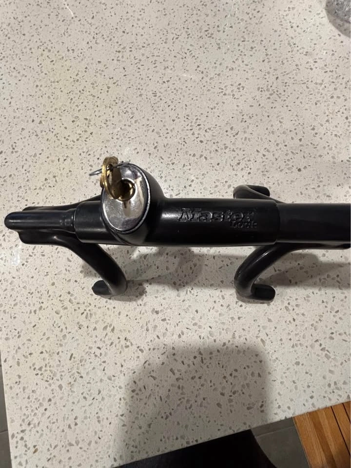 Master Lock Titanium High Security Steering Wheel Lock. Features a quad lock design and is made from titanium material. Convenient push button lock, key required to unlock. 2 keys provided. Cash only.