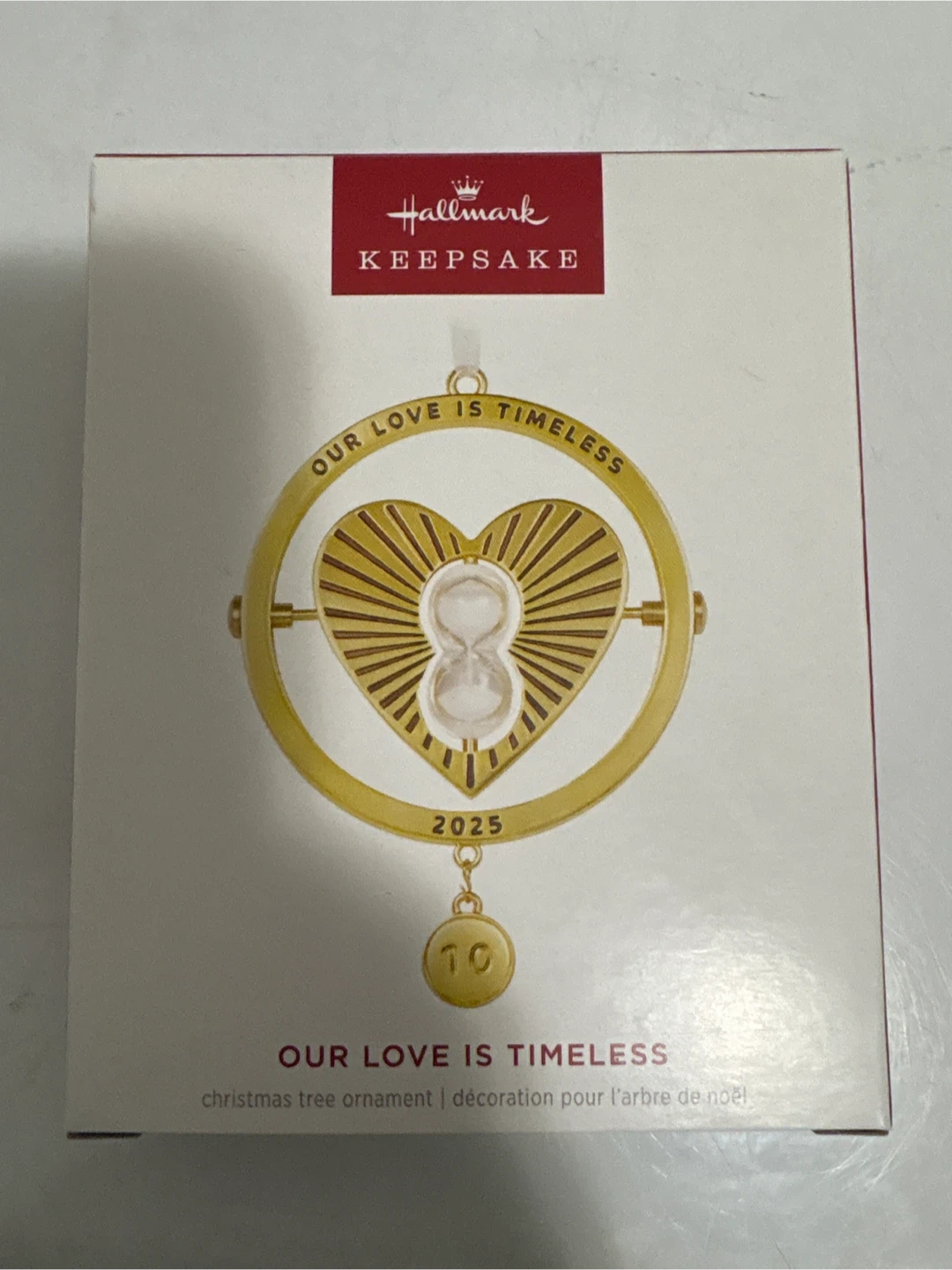 This is a Hallmark Keepsake Christmas tree ornament from 2025. It's titled "Our Love Is Timeless" and features a heart design with an hourglass. Metal construction. Includes charms for personalization.
