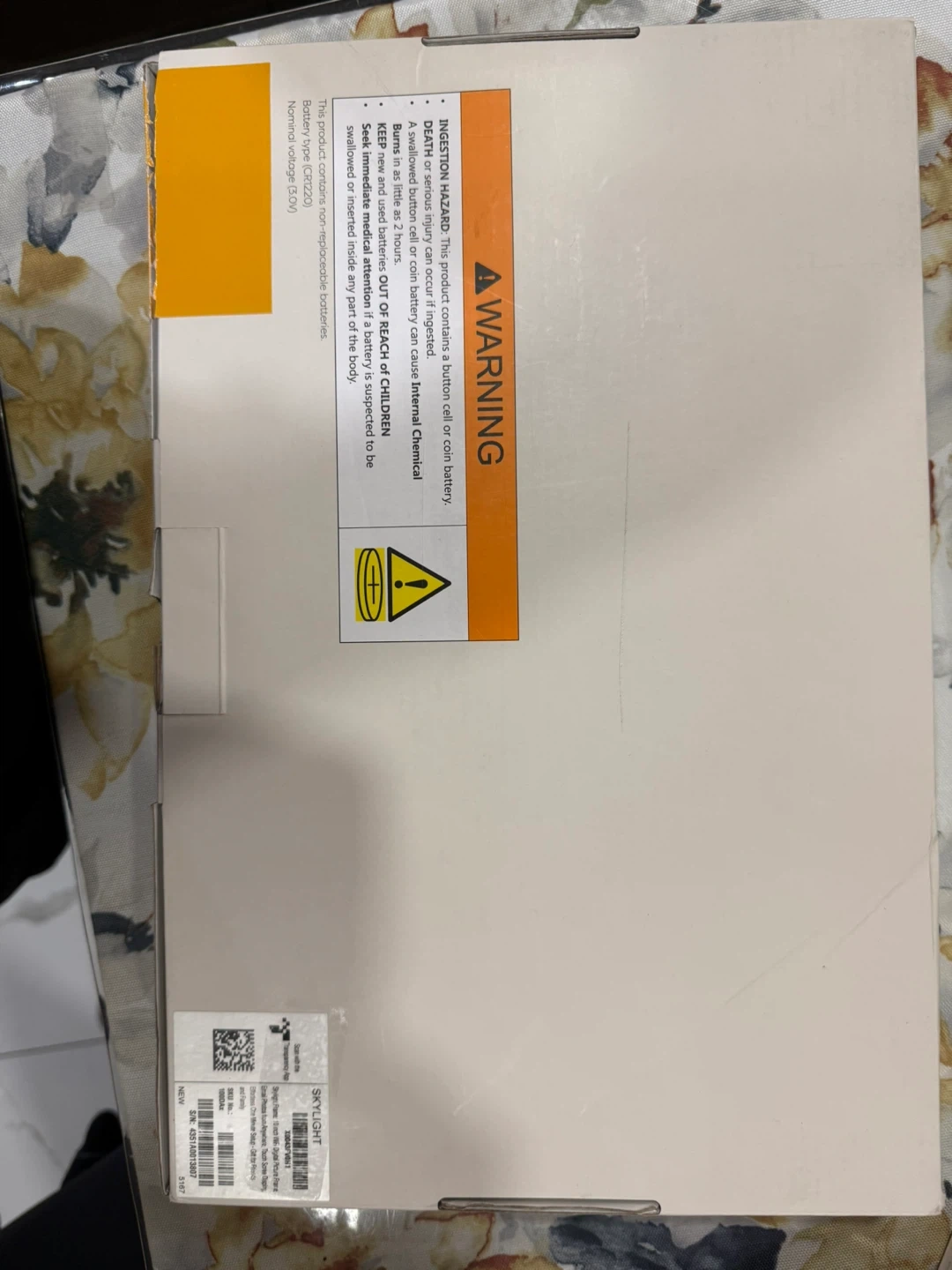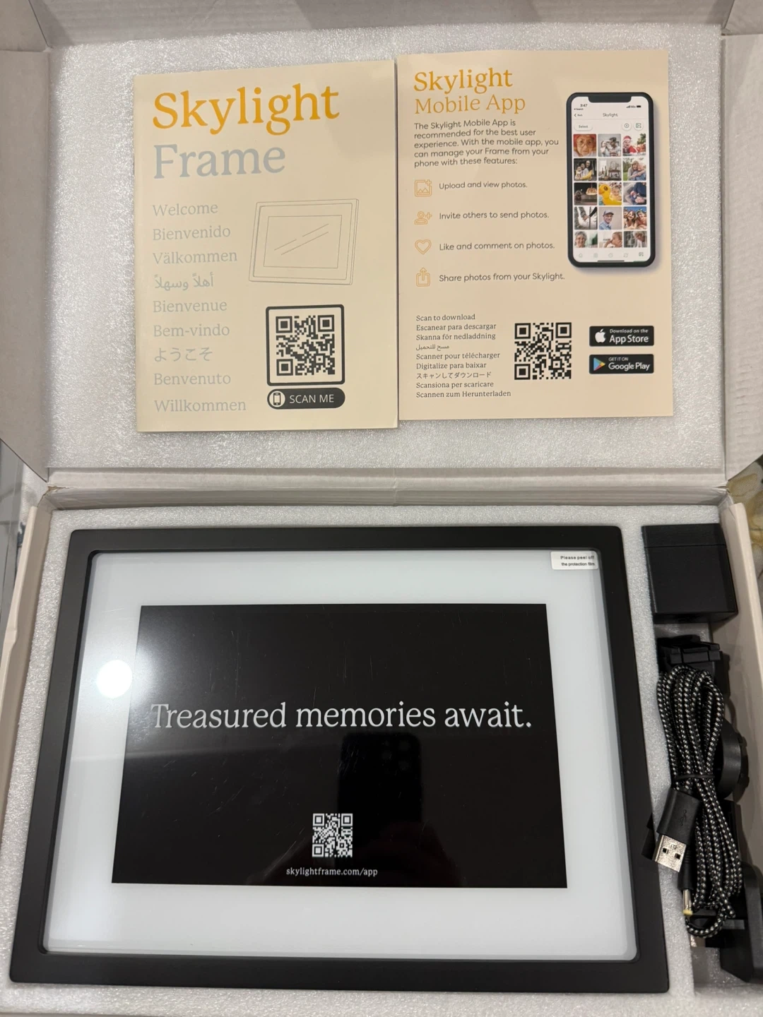 This is a Skylight Frame digital photo frame. It has a large screen to display your treasured memories. The Skylight Mobile App lets you upload and view photos, and invite others to send photos. It's great for easily sharing photos with loved ones!