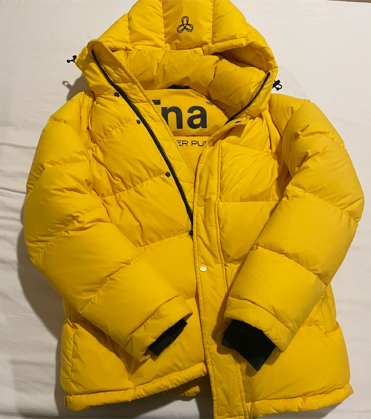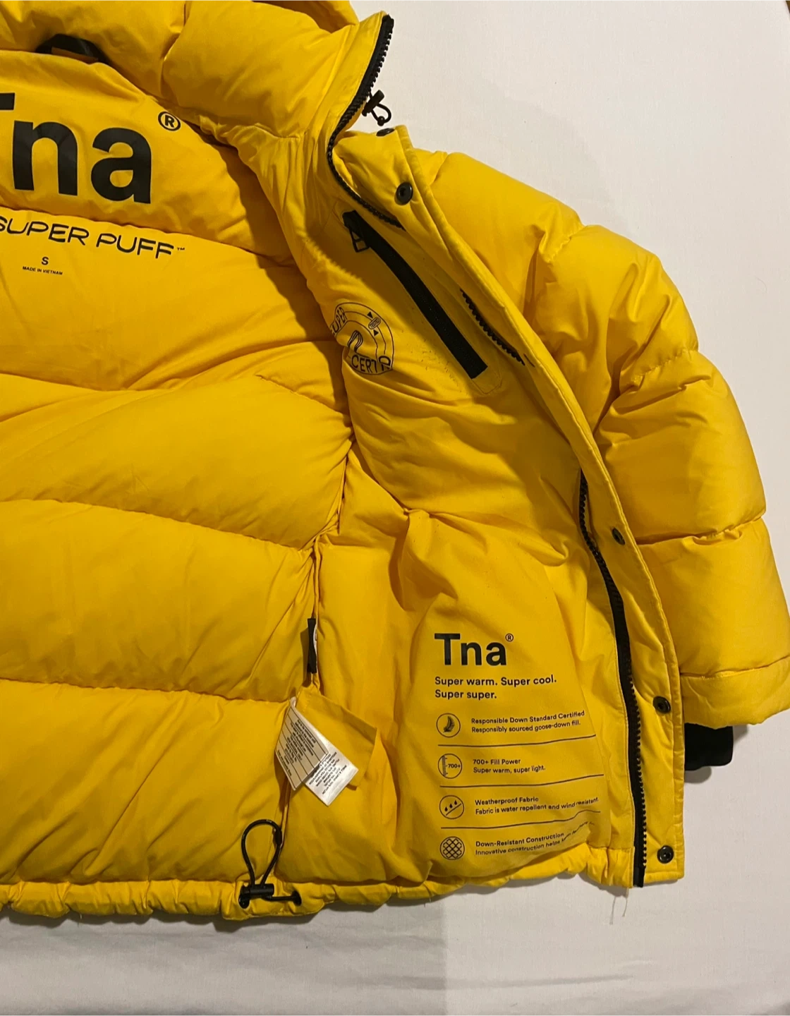 Tna The Super Puff jacket in yellow. This puffer jacket is super warm and features a 700 fill power and waterproof fabric. It's designed for cold weather. Size S