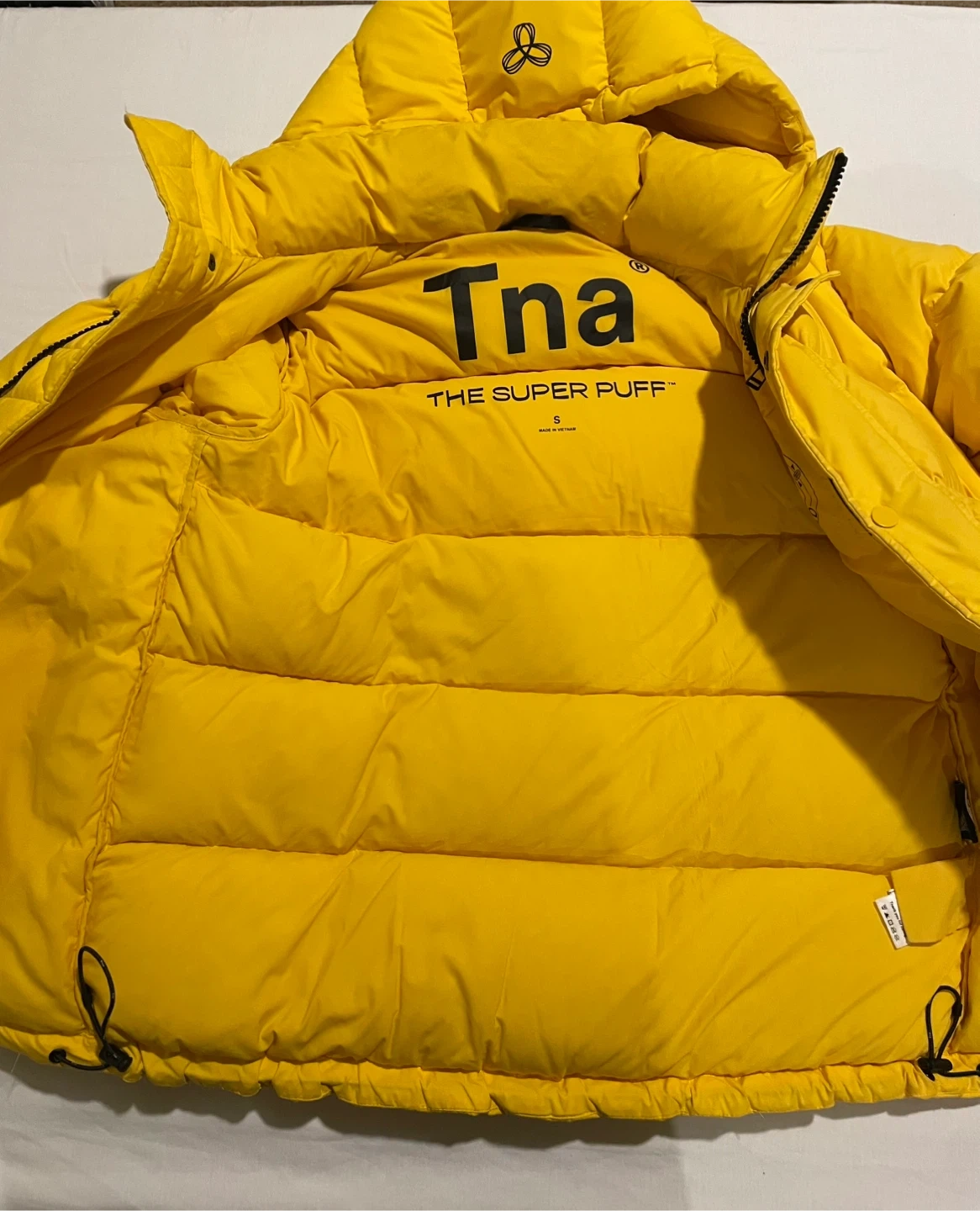 Tna The Super Puff jacket in yellow. This puffer jacket is super warm and features a 700 fill power and waterproof fabric. It's designed for cold weather. Size S