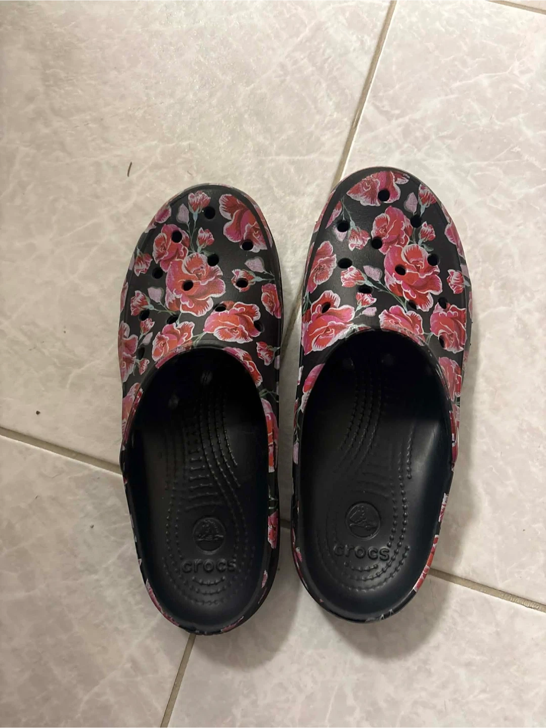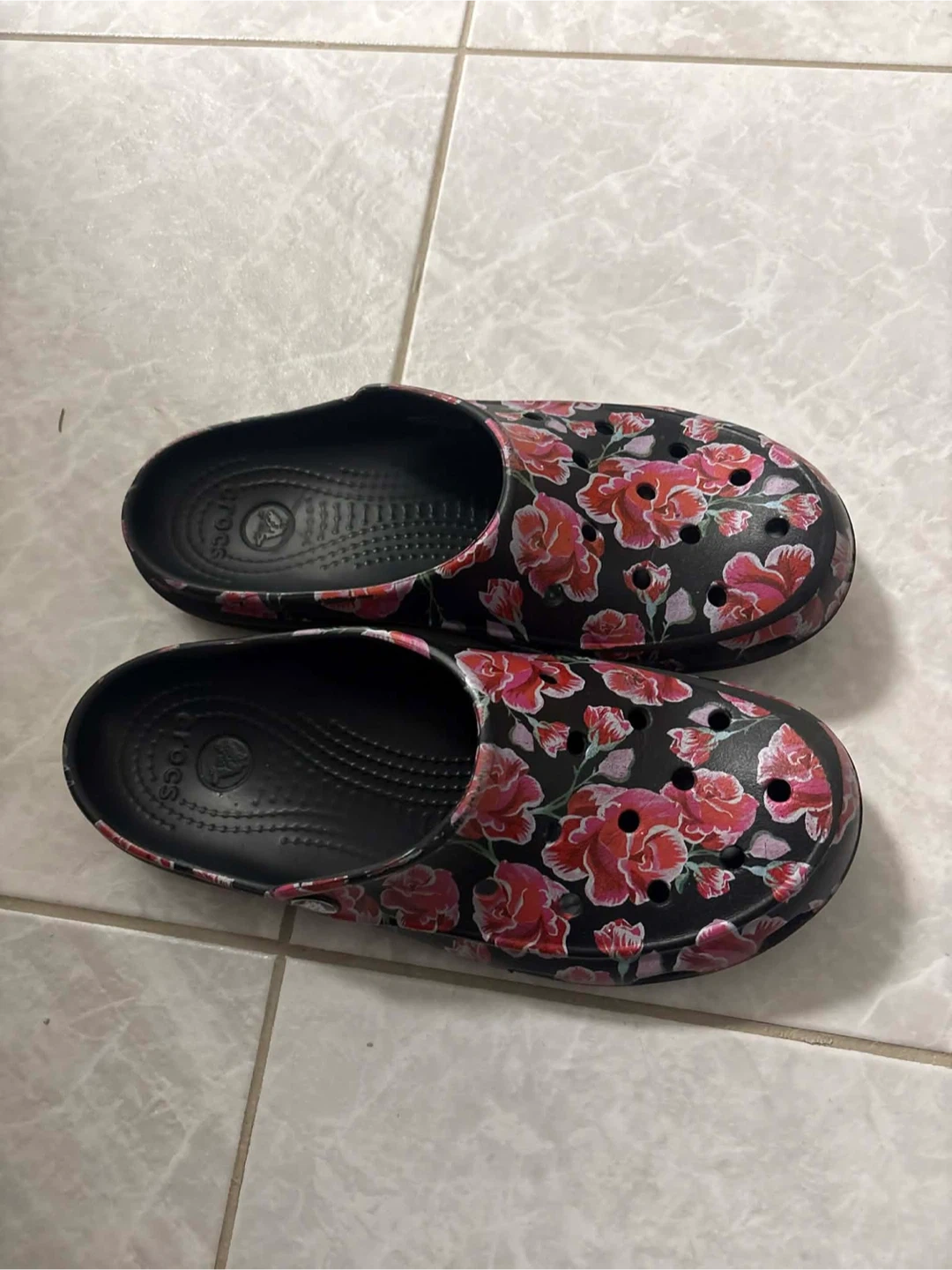 These black Crocs feature a bold pink and red floral print. They're comfortable and easy to slip on. Perfect for casual wear! Pick up cash only