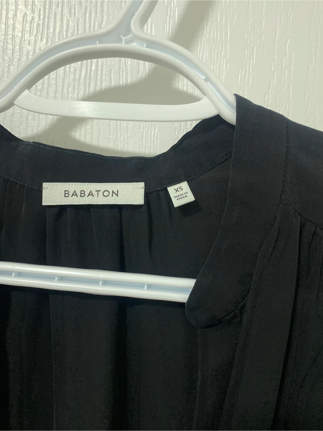 This is a black Babaton romper in size XS. It's made of a lightweight fabric and features a drawstring waist. It has a button-up front and long sleeves. Pick up cash only