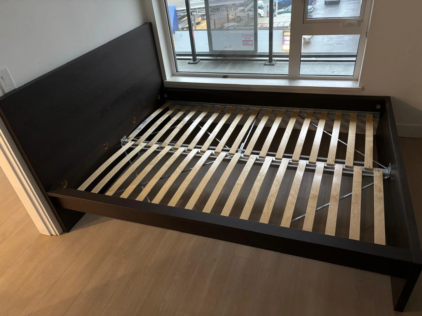 Dark brown queen bed frame with a wooden slatted base. It's made of wood and has a simple, modern design. This frame is ready for a mattress and box spring.