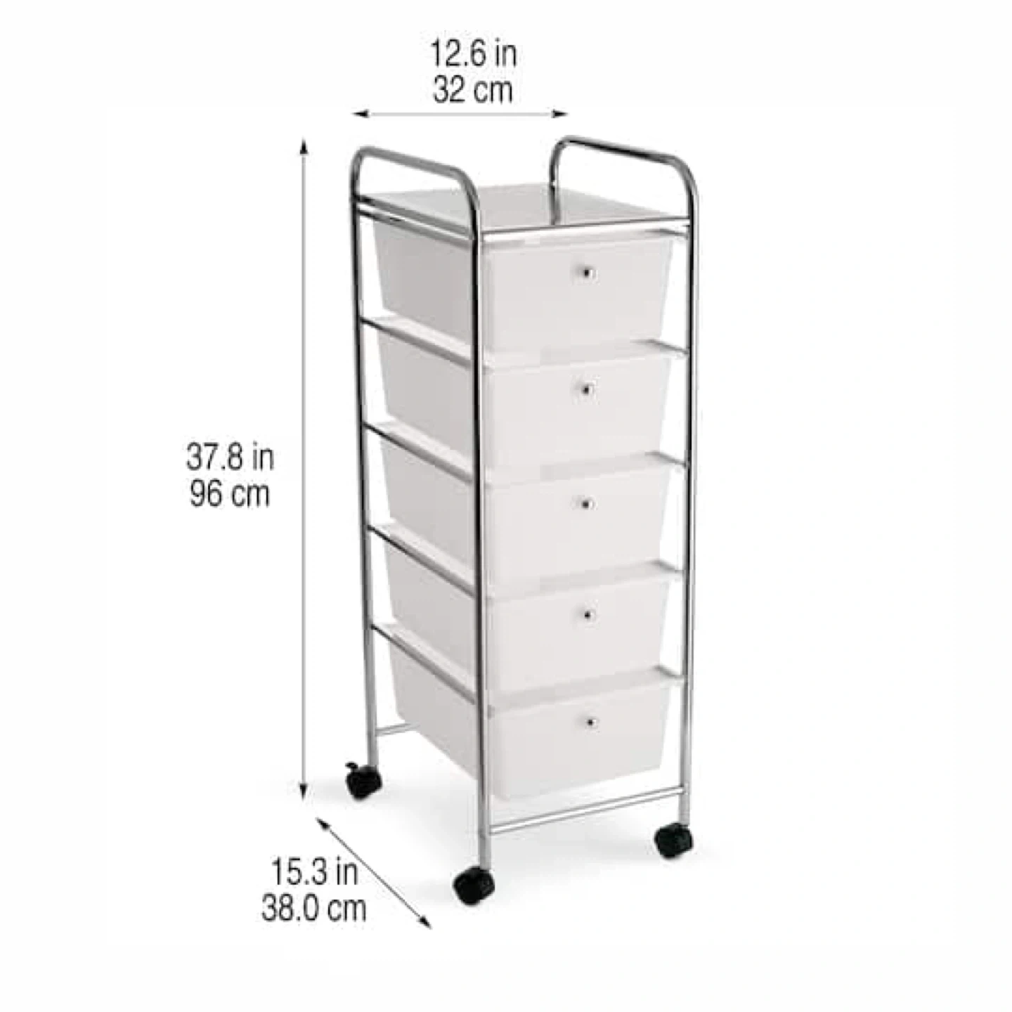 This 5 drawer rolling cart offers convenient storage and organization. The cart features a chrome metal frame and clear plastic drawers for easy visibility. Its compact size makes it a great addition to craft rooms, offices, or bedrooms. Dimensions are 12.6 in W x 15.3 in D x 37.8 in H.