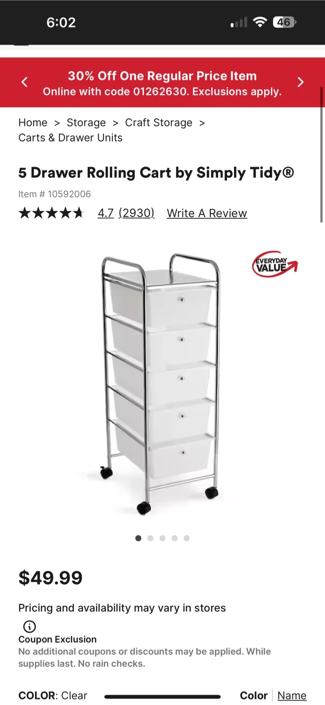 This 5 drawer rolling cart offers convenient storage and organization. The cart features a chrome metal frame and clear plastic drawers for easy visibility. Its compact size makes it a great addition to craft rooms, offices, or bedrooms. Dimensions are 12.6 in W x 15.3 in D x 37.8 in H.