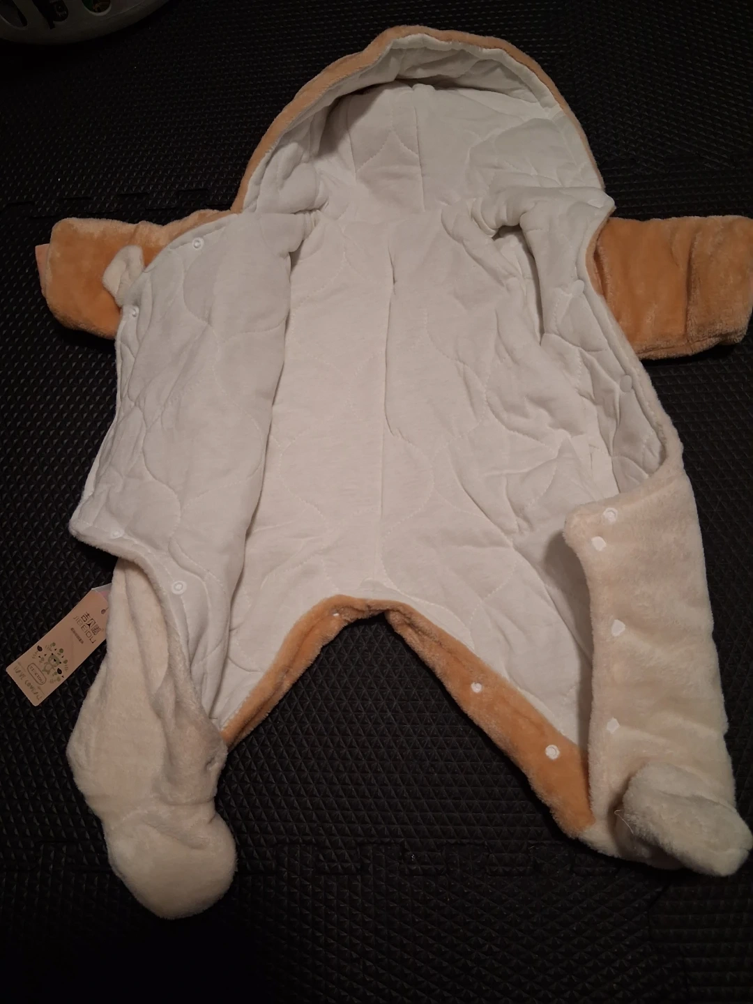 Adorable orange-and-cream baby snowsuit with a cute face design. Fully lined with soft material for warmth, it features snap closures for easy dressing. Perfect for ages 0 to 2.