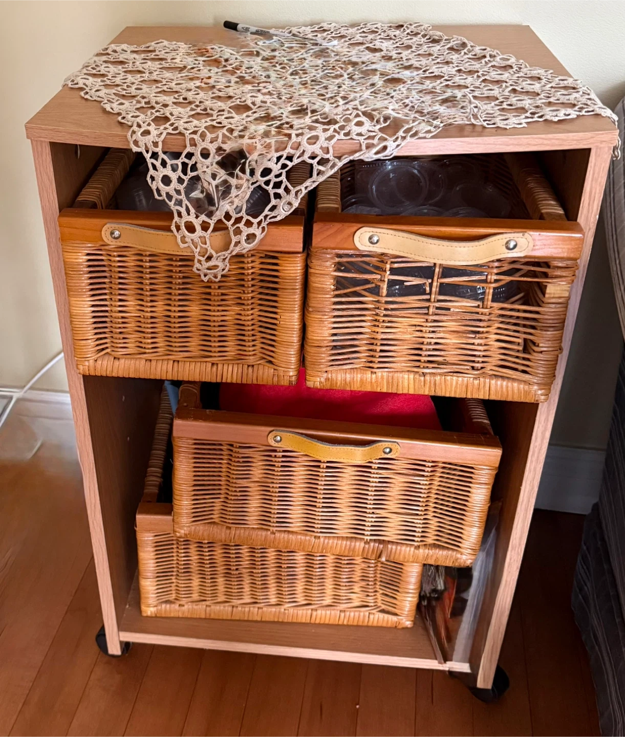 Wooden rolling cart with four woven baskets. Baskets have faux leather handles. It's great for organizing crafts or small items! The cart has wheels for easy mobility.