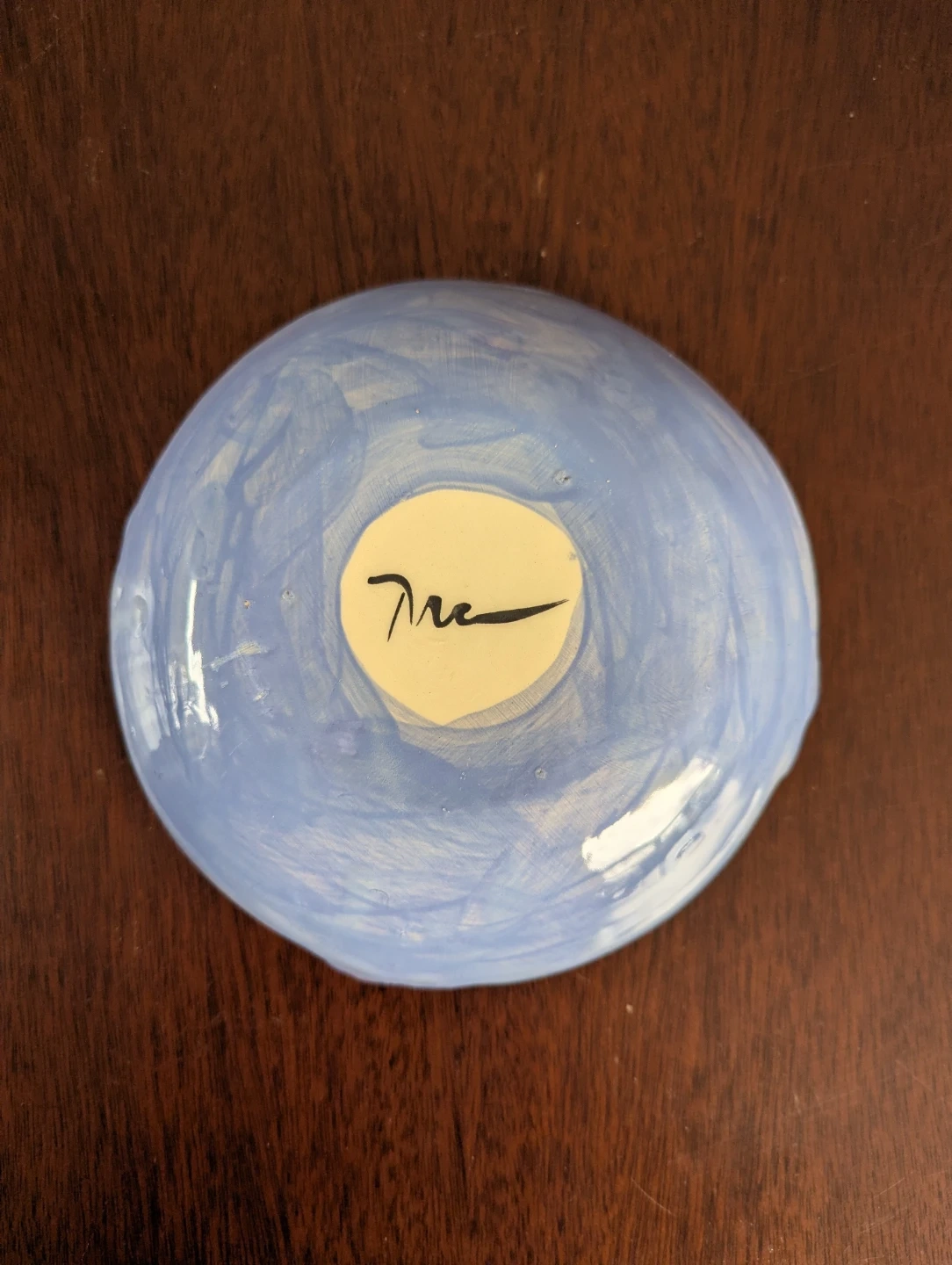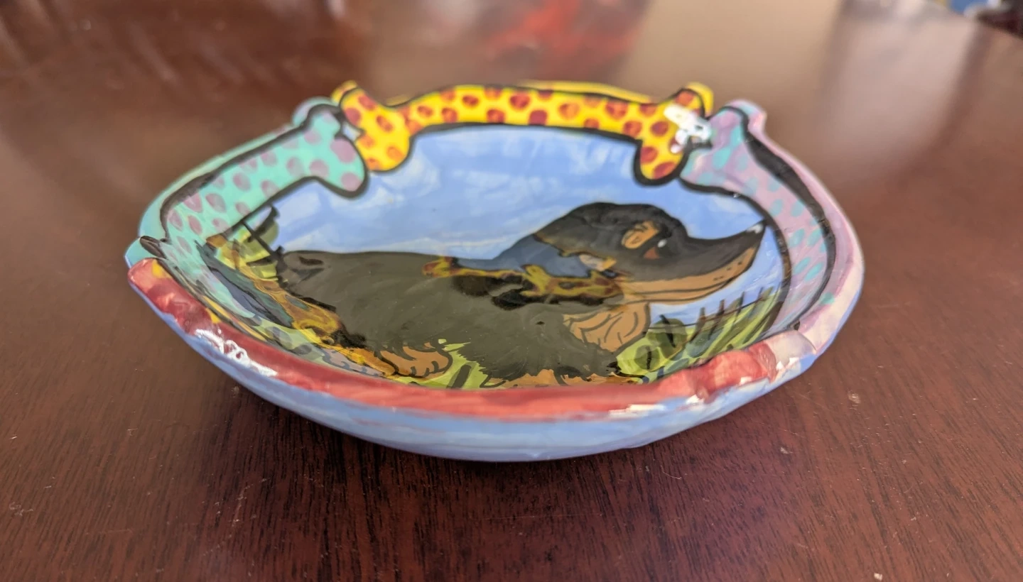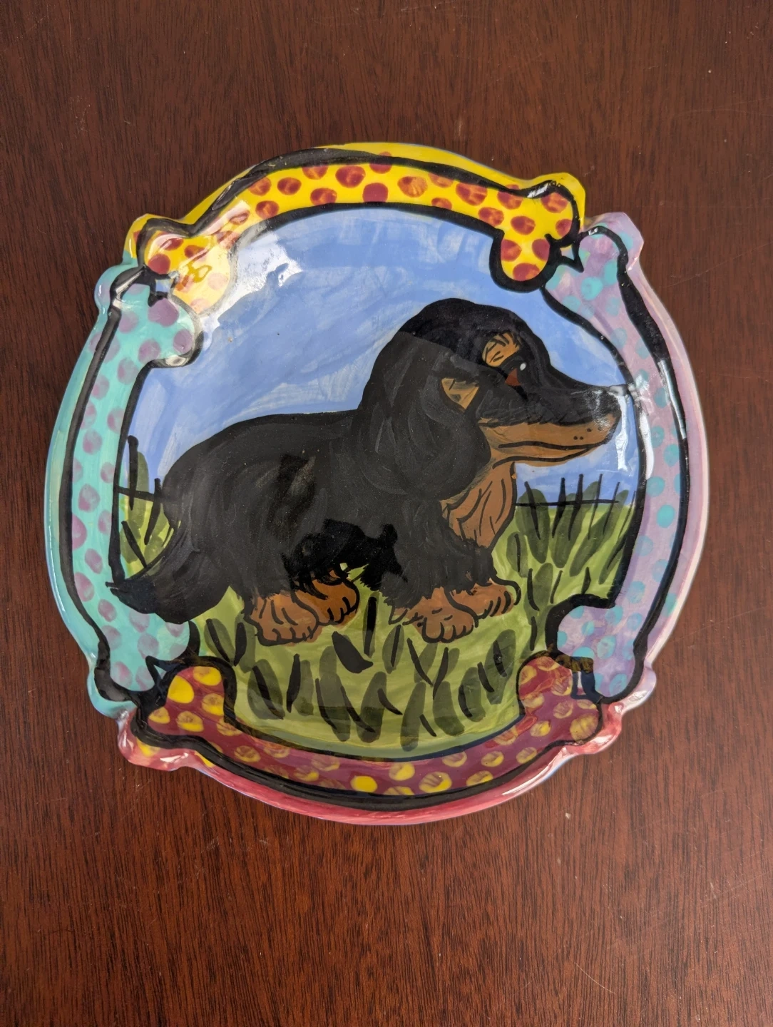 This is a ceramic dish featuring a hand-painted dachshund. It's perfect for holding small trinkets or keys. The dish has a colourful, decorative border.