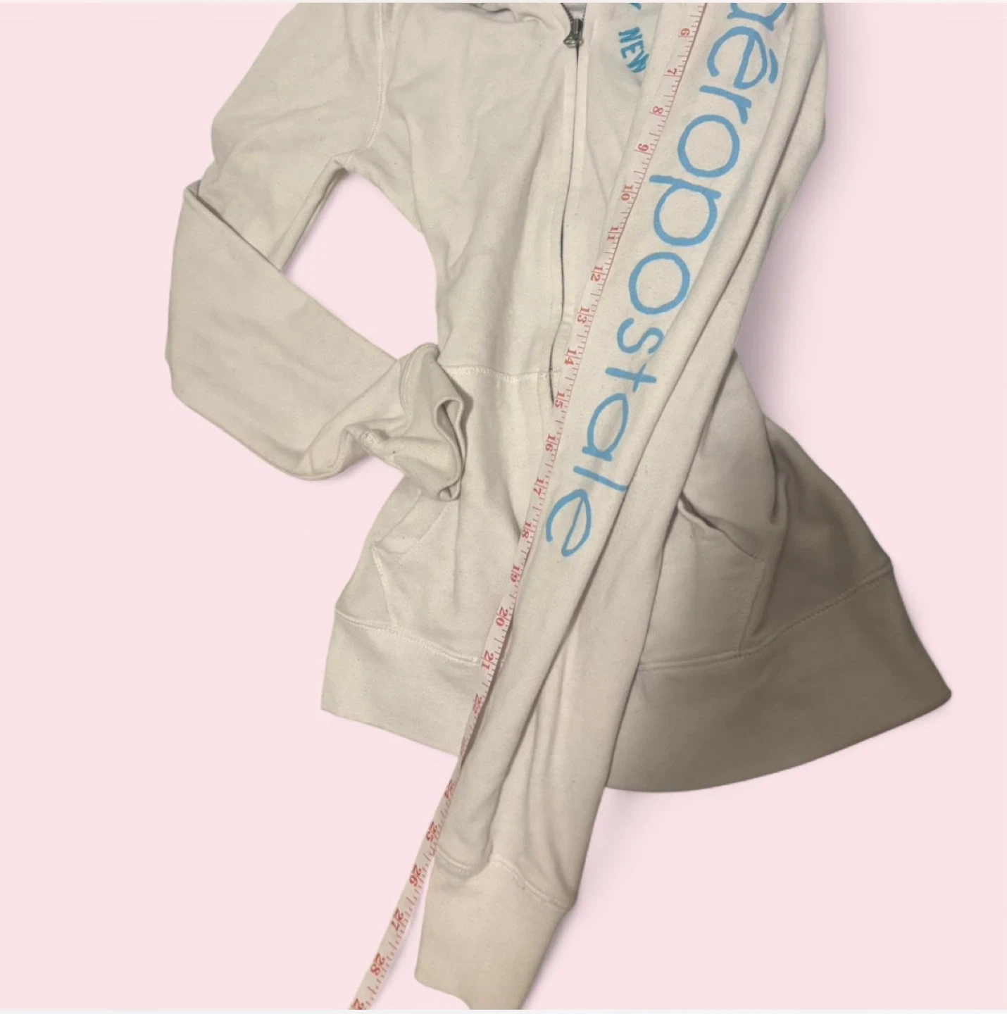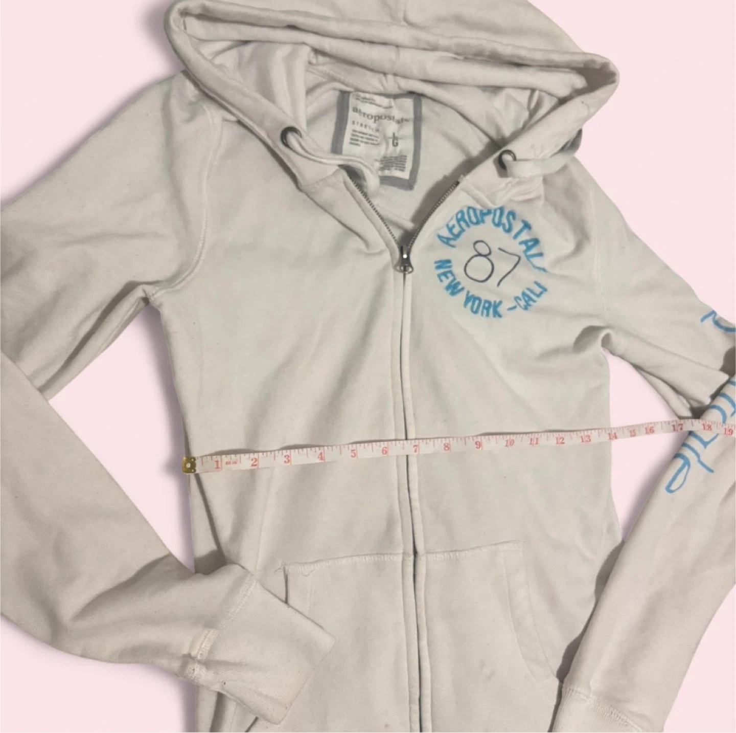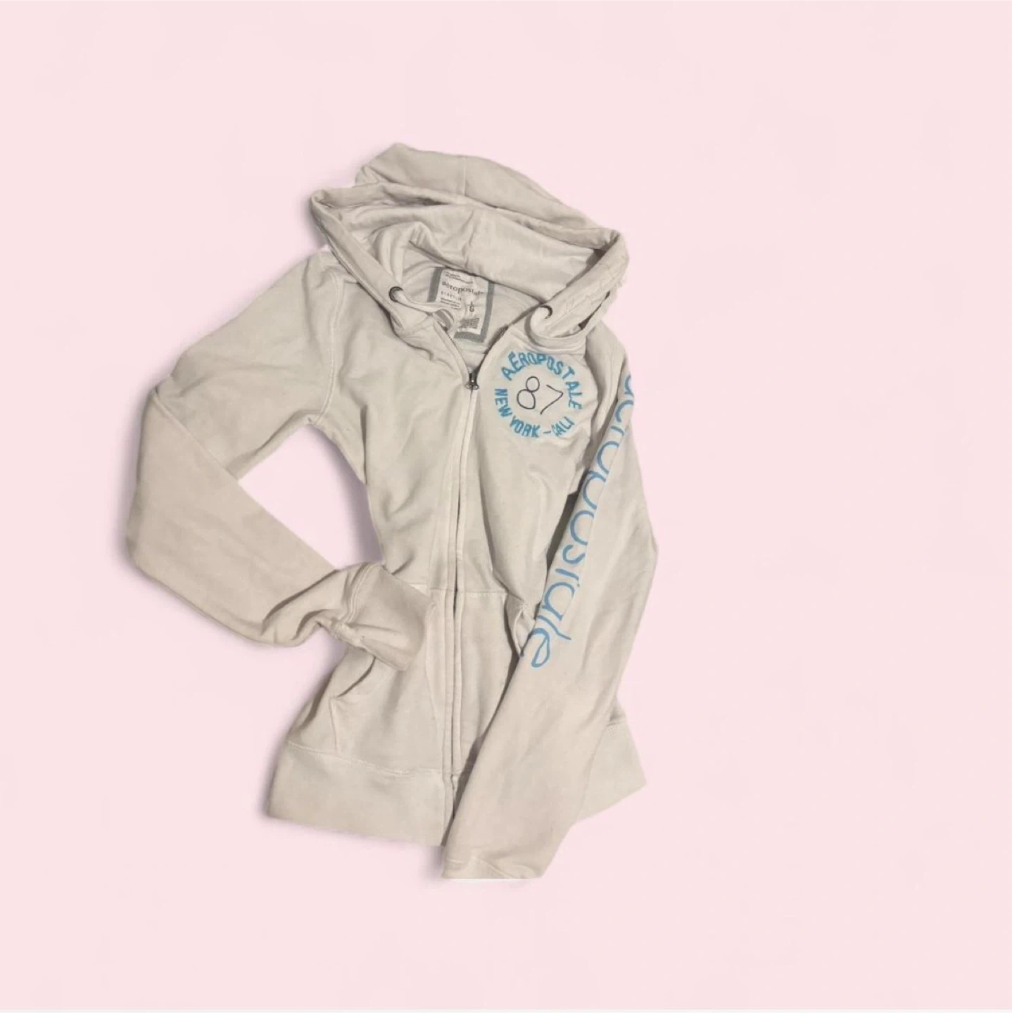 This is a white Aeropostale zip-up hoodie. It has "Aeropostale New York Cali" graphics on the chest and sleeve. It's made of a soft cotton blend.