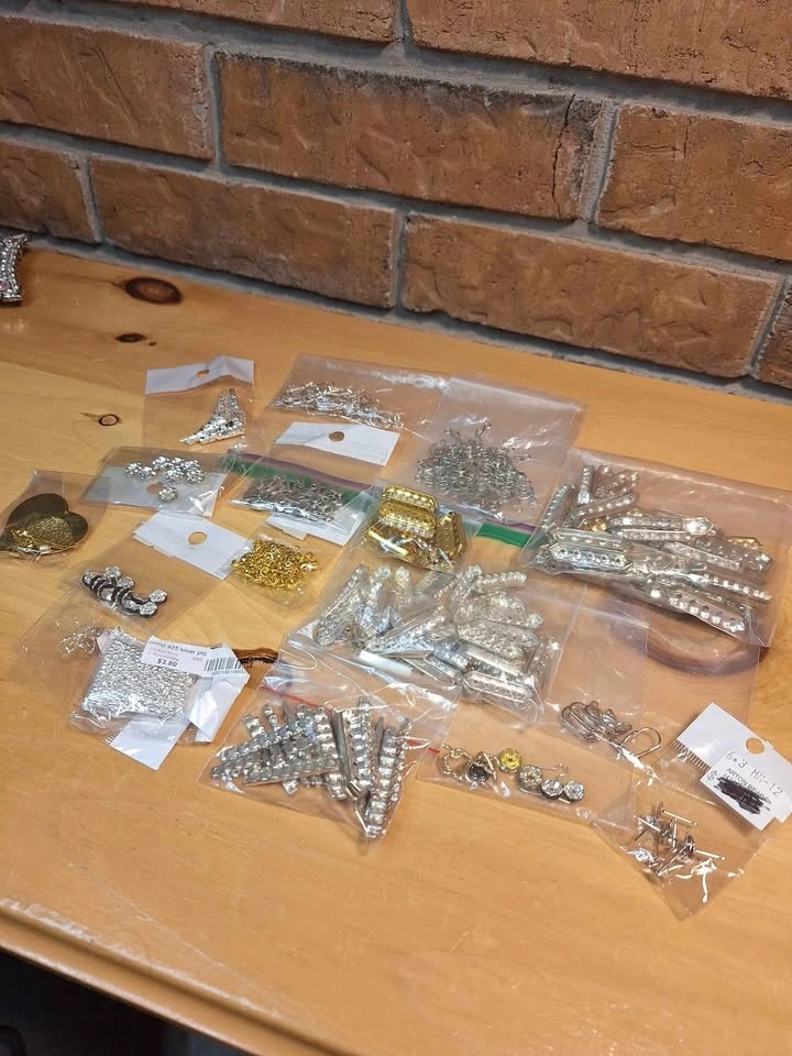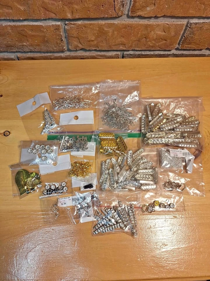 Mixed lot of earrings attachments/posts, charms, crimp beads, bales, bracelet/necklace string dividers, spacer beads and more - some findings are silver plated. Looking to sell these as a lot. I'd be happy to knock the price down when bundling with my other listings!