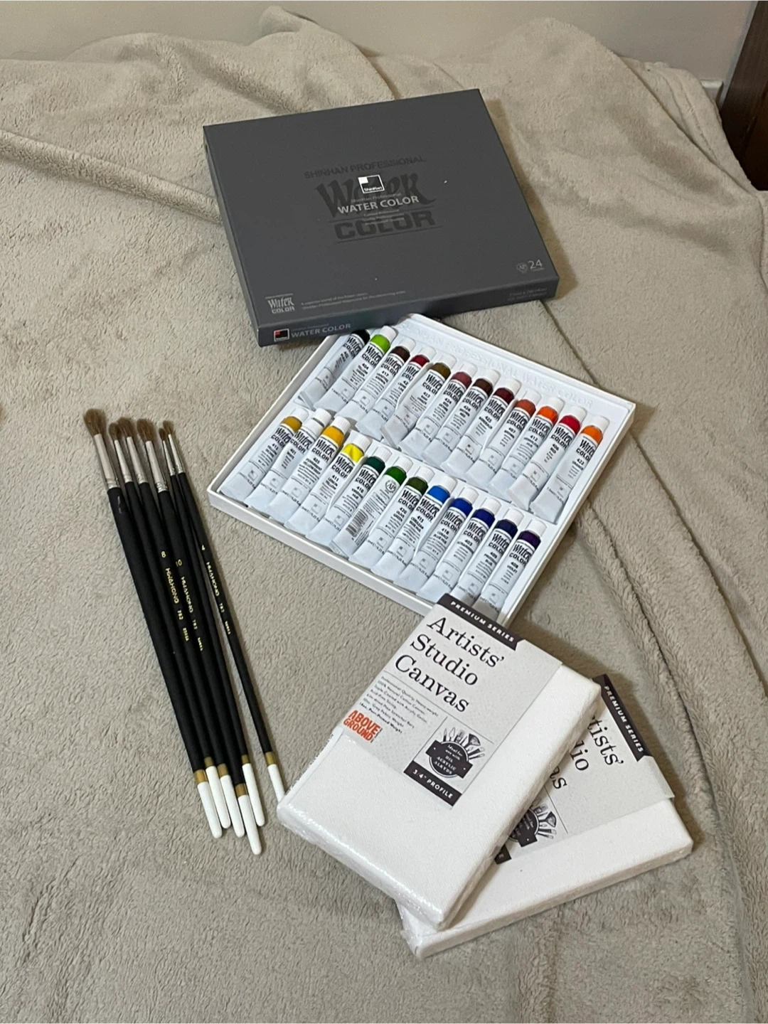 This set includes a Shinhan Professional 24-color watercolor paint set and a pack of 5 artists' studio canvases. It also comes with a set of 5 brushes. The canvases are 3/4" profile.