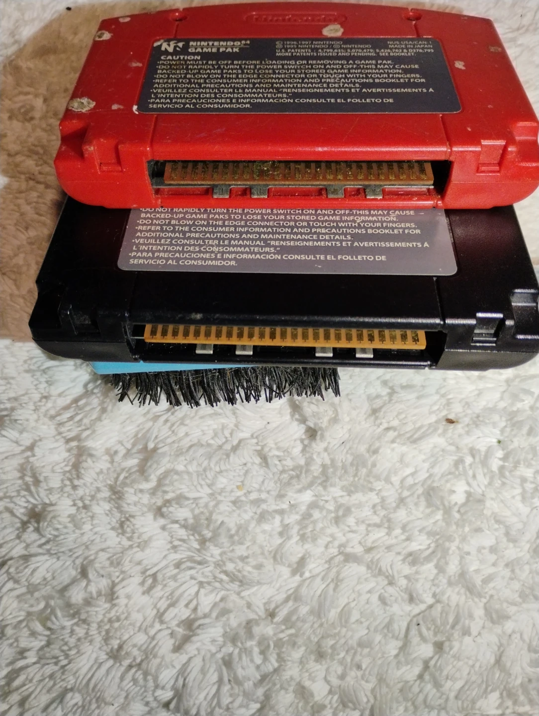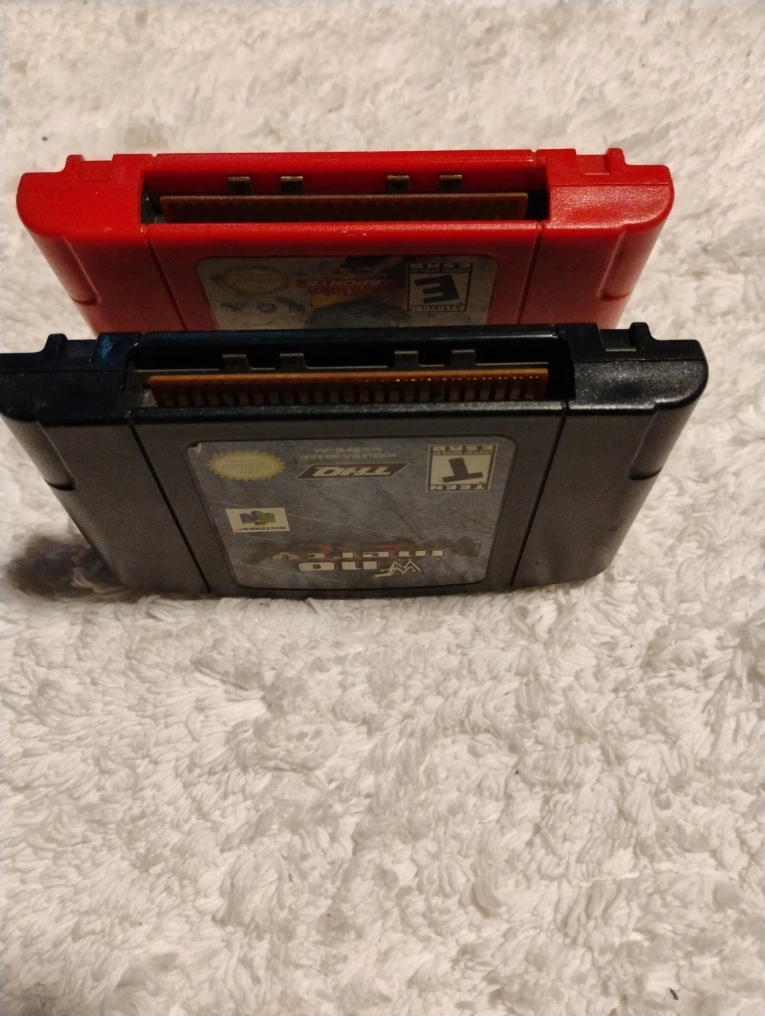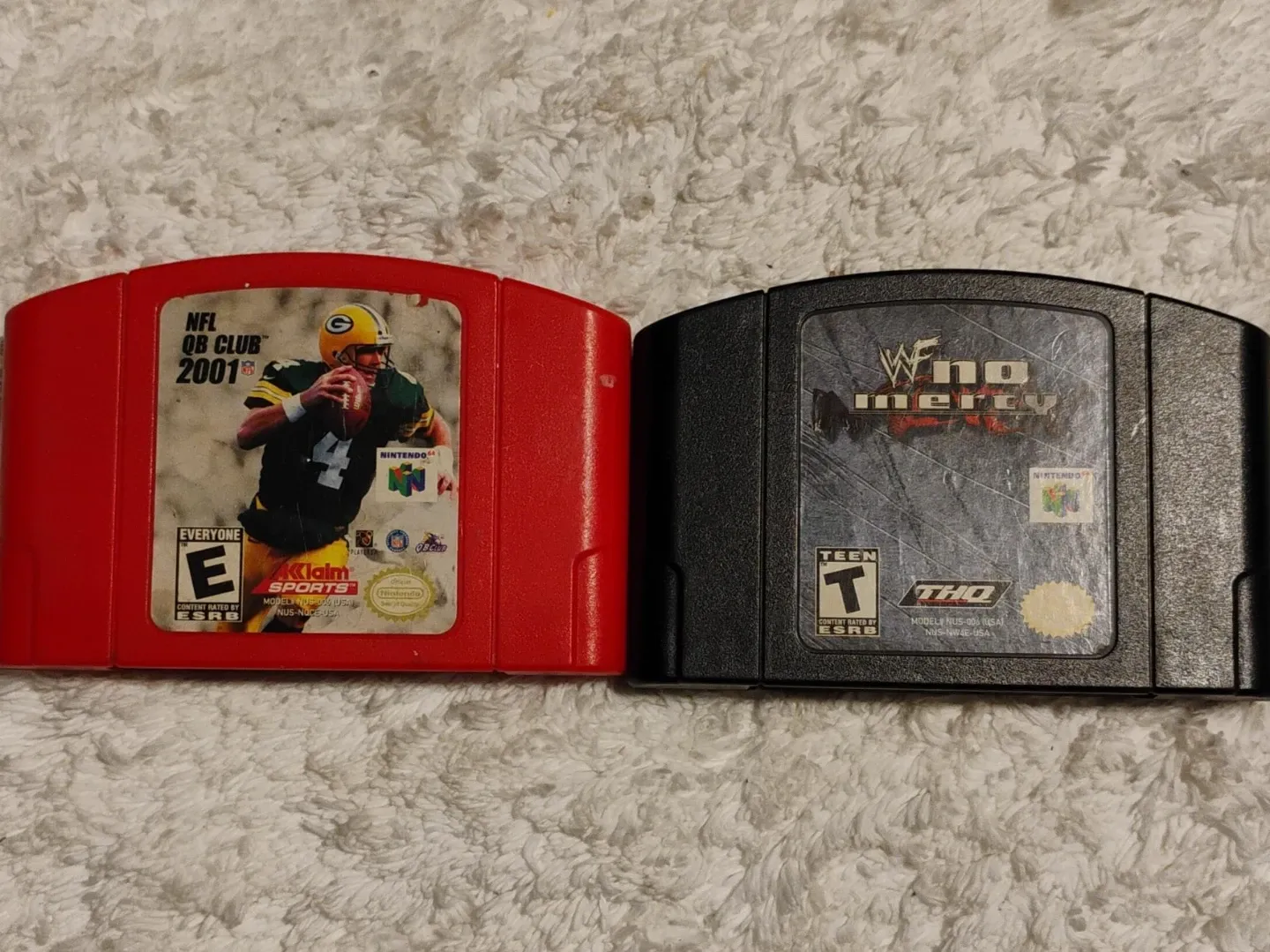 Two Nintendo 64 game cartridges are included: WWF No Mercy and NFL QB Club 2001. Both games are rated T for Teen and E for Everyone respectively by ESRB.