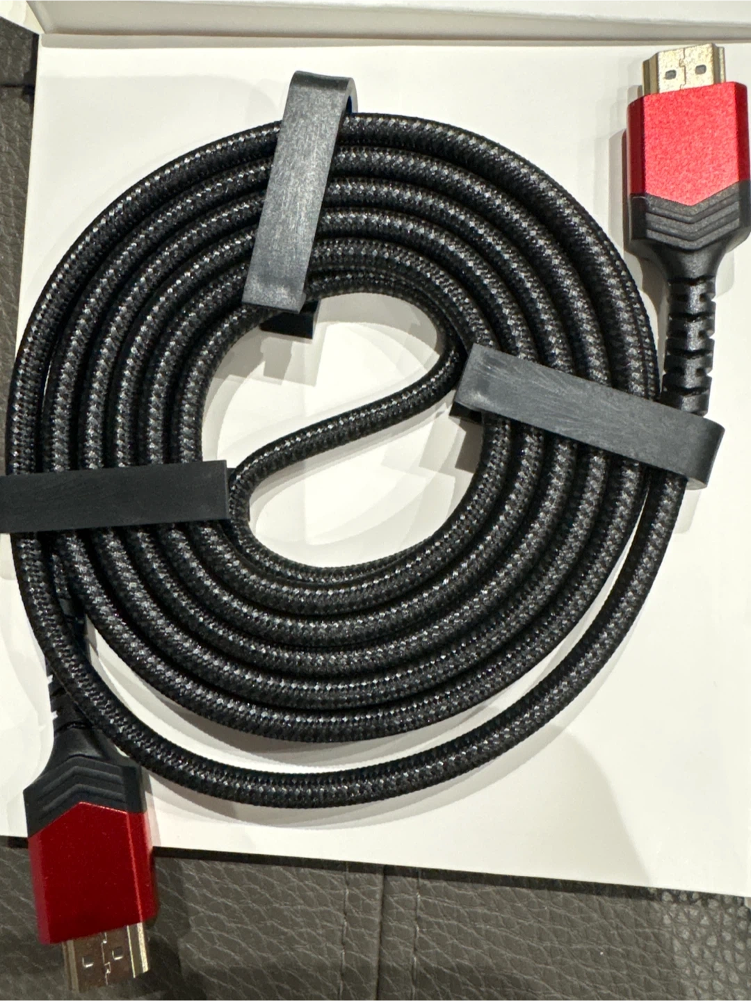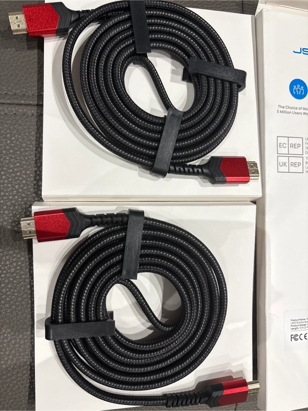 These are two JSAUX HDMI cables. They're black with red accents on the connectors. The cables have a braided exterior for durability. Each cable measures 6.5 ft (2m) in length.