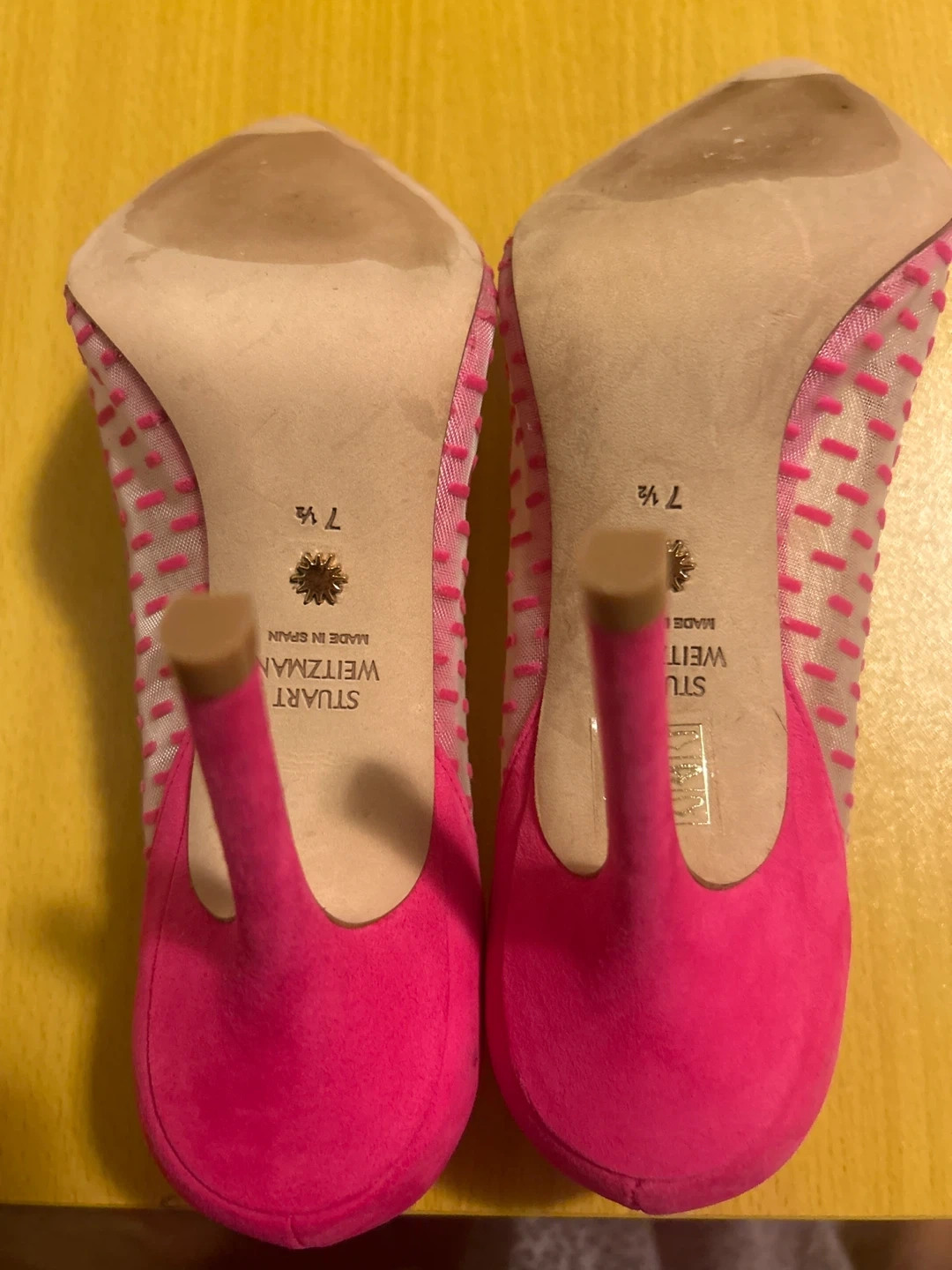 Stuart Weitzman heels in a vibrant pink. They feature a mesh overlay with a dotted pattern and suede trim. These heels are perfect for adding a pop of colour to any outfit!