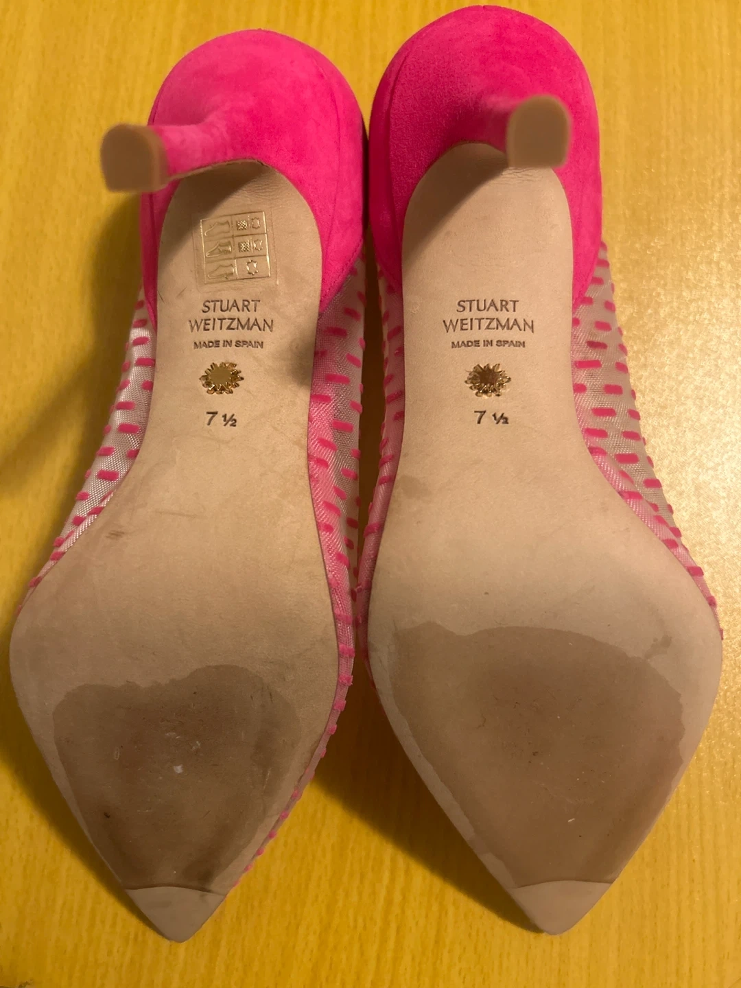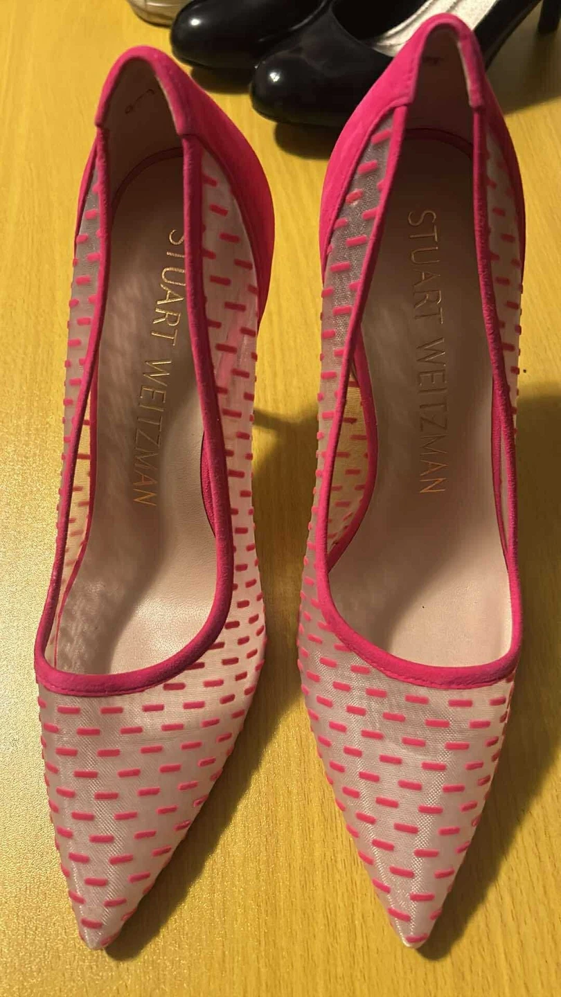 Stuart Weitzman heels in a vibrant pink. They feature a mesh overlay with a dotted pattern and suede trim. These heels are perfect for adding a pop of colour to any outfit!